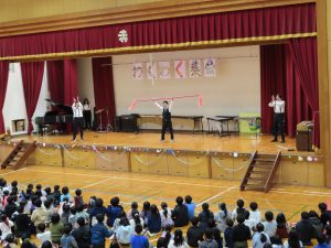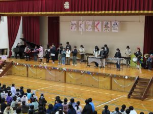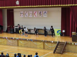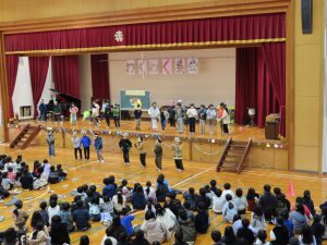12月5日(金)、全校児童が楽しみにしていた わくわく集会が行われました。 今年は23チームがエントリーし、歌やダンス、漫才、劇、ピアノ演奏、お笑い、金管バンド、音読劇、よさこい、バンド演奏など、バラエティ豊かなパフォーマンスが披露されました。どのチームも練習の成果を存分に発揮し、全校児童や保護者の前で堂々とした姿を見せてくれました。会場は手拍子やレスポンス&コールで大盛り上がり!子どもたちの表現力の高さに、会場全体が感動に包まれました。