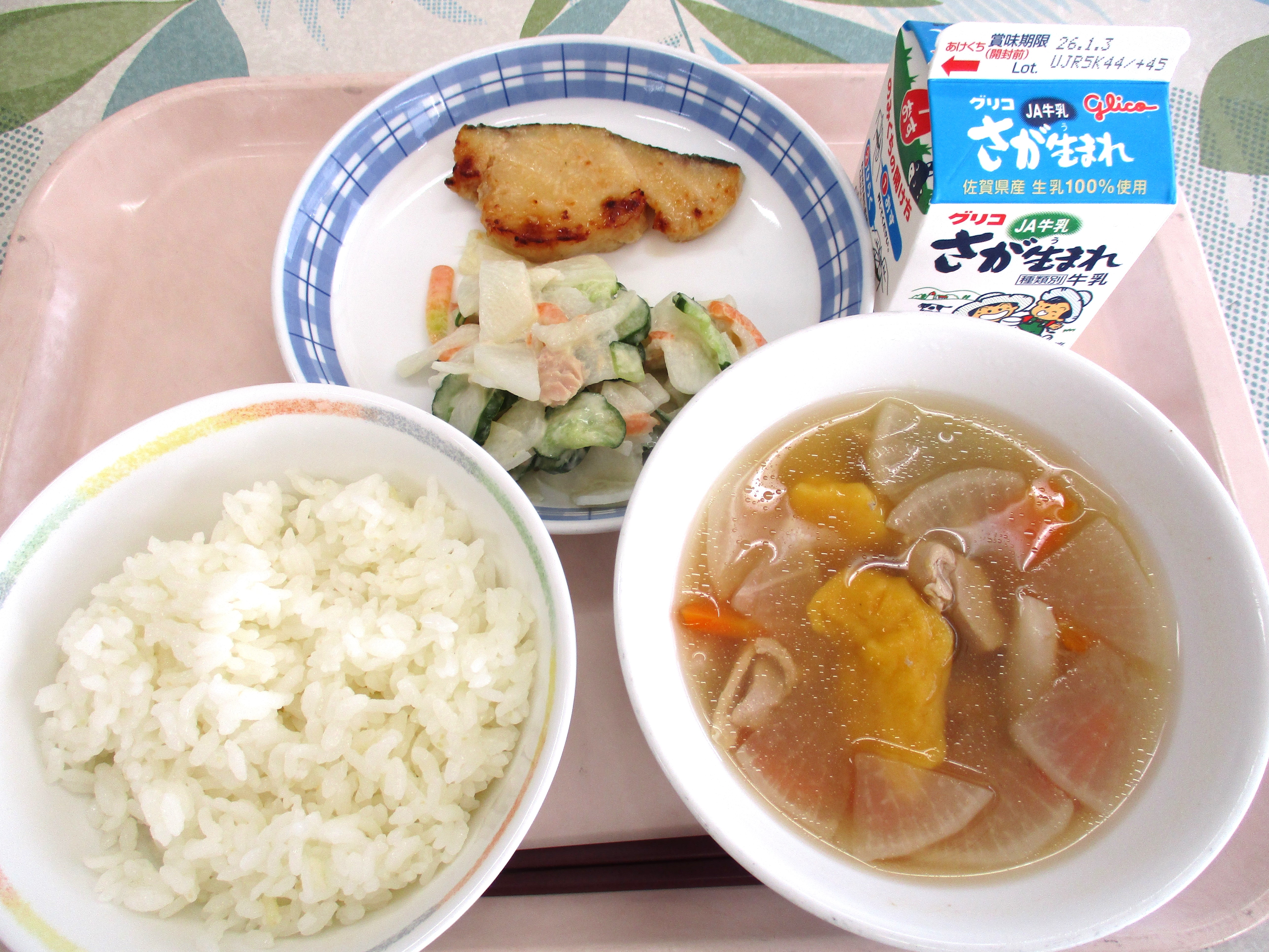 HOME > お知らせ > 今日の給食 > 12月22日の給食~冬至食~ 12月22日の給食~冬至食~ 入力日2025年12月22日 閲覧数27 献立名 ごはん 牛乳 鱈の柚子味噌煮 大根のサラダ 南瓜のすいとん 「冬至 」の食事 について 今日 は、1 年中 で昼 の時間 が一番短 い「冬至 」です。この冬 、病気 をしませんようにと、この日 にかぼちゃを食 べたり、おふろに「ゆず」を入 れた「ゆず湯 」に入 る習慣 があります。今日 の給食 では、「ゆず」や「かぼちゃ」を使 ったメニューになっています。「ゆず」と「かぼちゃ」が、どこに使 われているか探 してみましょう。 前へ 一覧へ戻る 次へ