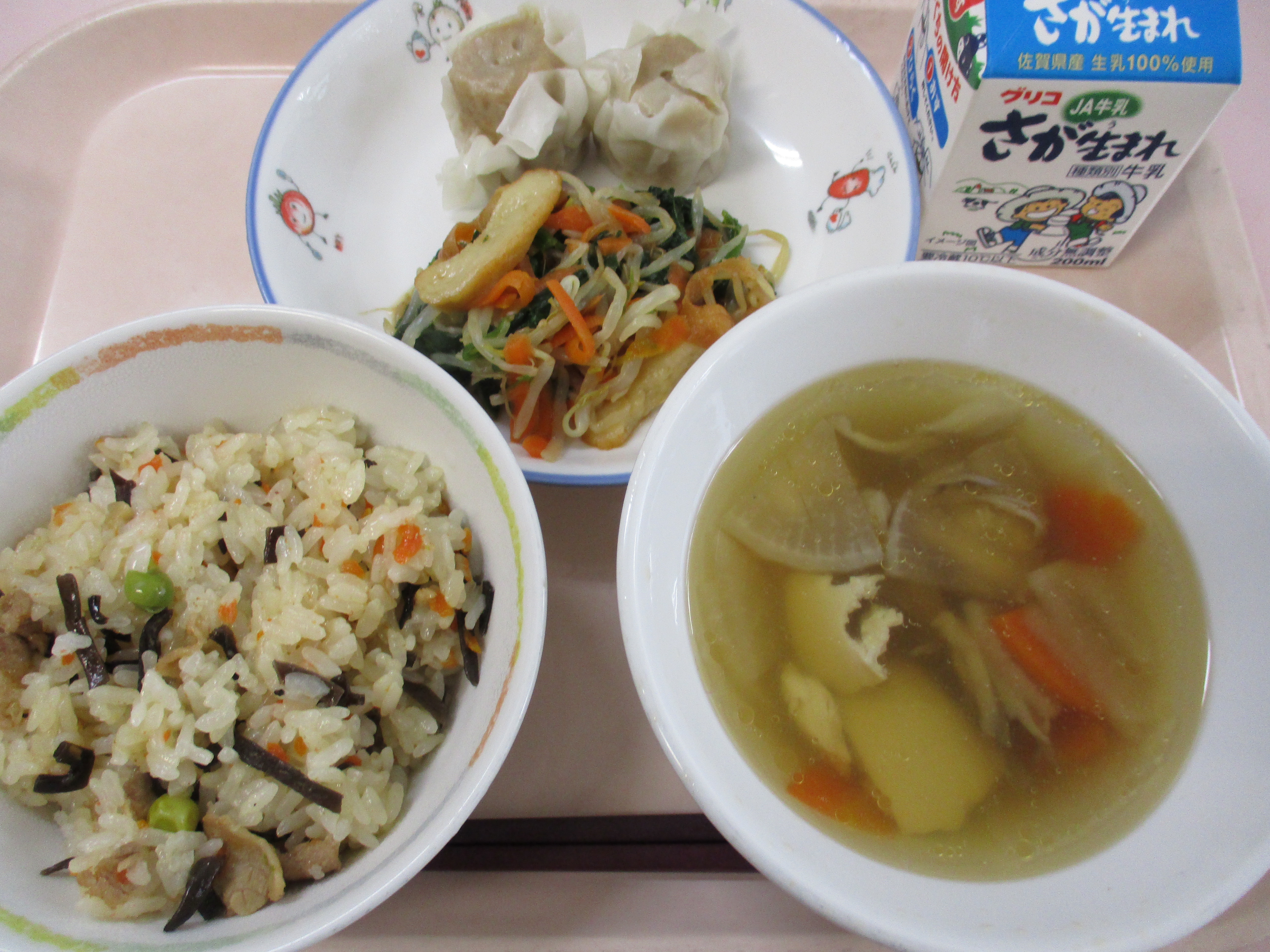 HOME > お知らせ > 今日の給食 > 12月11日(木)の給食 12月11日(木)の給食 入力日2025年12月12日 閲覧数18 献立名 中華おこわ 牛乳 焼売 もやしとほうれんそうのおひたし 豆腐のふぶき汁 「中華おこわ」について 「おこわ」は、もち米 を蒸 したごはんのことです。もち米 を使 うので、モチモチとした食感 があります。今日 の給食の「中華おこわ」は、鶏肉 や野菜 をごま油 で炒 めて、中華風 に味付 けをして炊 き上 げました。普通 のお米 の「うるち米 」だけをたいた「たきこみごはん」と違 った食感 を味 わいながら食 べてみましょう。 前へ 一覧へ戻る 次へ