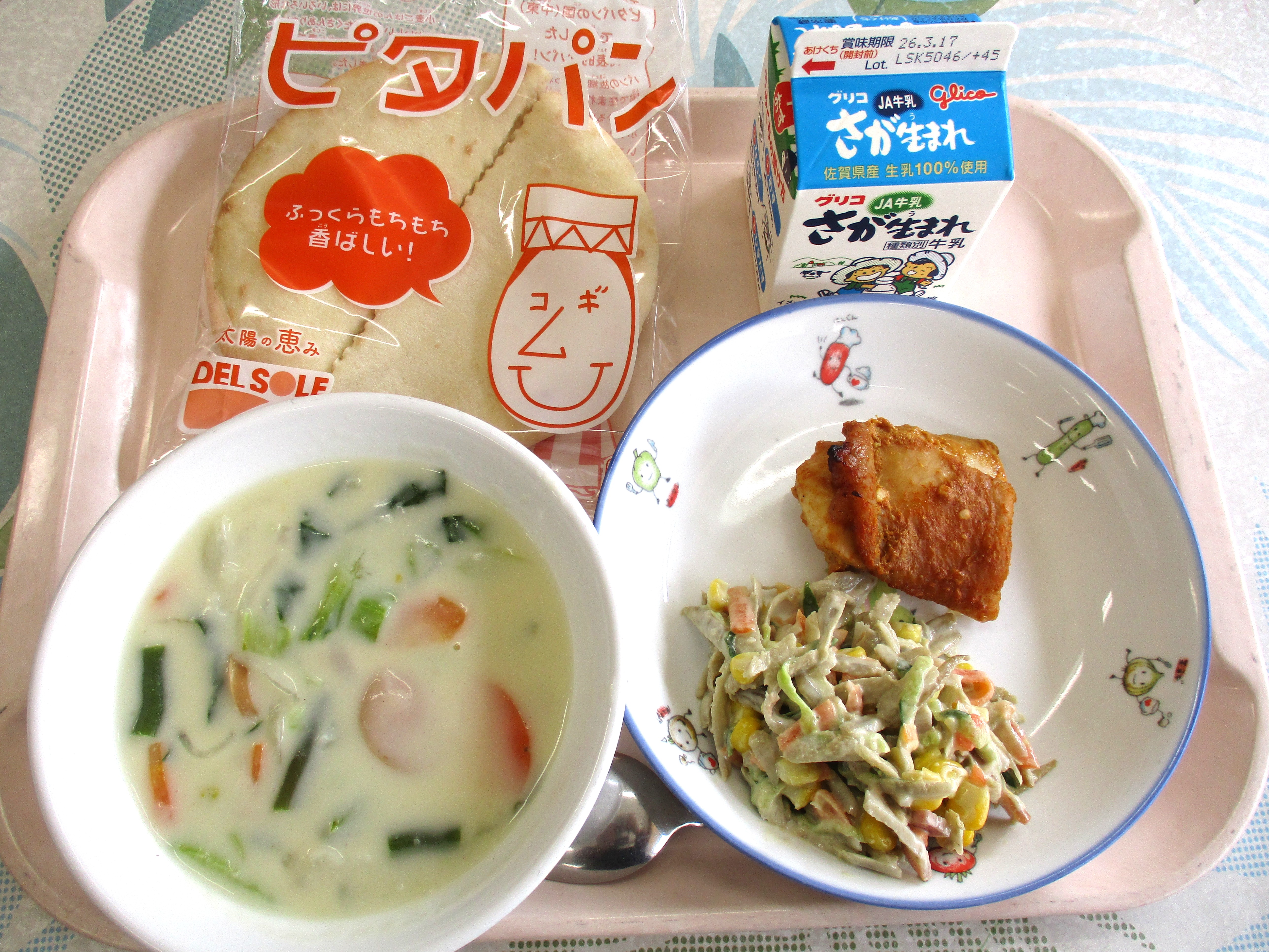 HOME > お知らせ > 今日の給食 > 3月4日(水)の給食 3月4日(水)の給食 入力日2026年3月4日 閲覧数41 献立名 ピタパン 牛乳 タンドリーチキン ごぼうのサラダ 白いんげん豆のクリームスープ 「ピタパン」について ピタパンは、エジプトで古 くから食 べられてきたパンです。300℃のオーブンで一気 に焼 くため、パンが大 きくふくらんで、中 に空洞 ができます。ピタパンをまんなかで半分 に切 ると、ポケットのような空洞 ができます。そこにタンドリーチキンやごぼうのサラダをはさんで食 べてみましょう。 前へ 一覧へ戻る 次へ