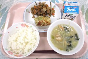 HOME > お知らせ > 今日の給食 > 3月6日(金)の給食 3月6日(金)の給食 入力日2026年3月6日 閲覧数44 献立名 ごはん 牛乳 ちくわのポテサラてんぷら 茎わかめの炒め煮 玉ねぎの味噌汁 「ちくわ」について ちくわは、魚をそのまますりつぶして作るので、高たんぱく、低脂肪(ていしぼう)で健康によい食べ物です。竹(たけ)や棒(ぼう)に魚のすり身をまきつけて焼き上げ、くしをぬくと竹の切り口に似(に)ていることから、この名がつきました。今日は、きれめを入れたちくわにポテトサラダをはさんで、天ぷらにしました。熊本県 のご当地料理 の一 つです。 前へ 一覧へ戻る 次へ
