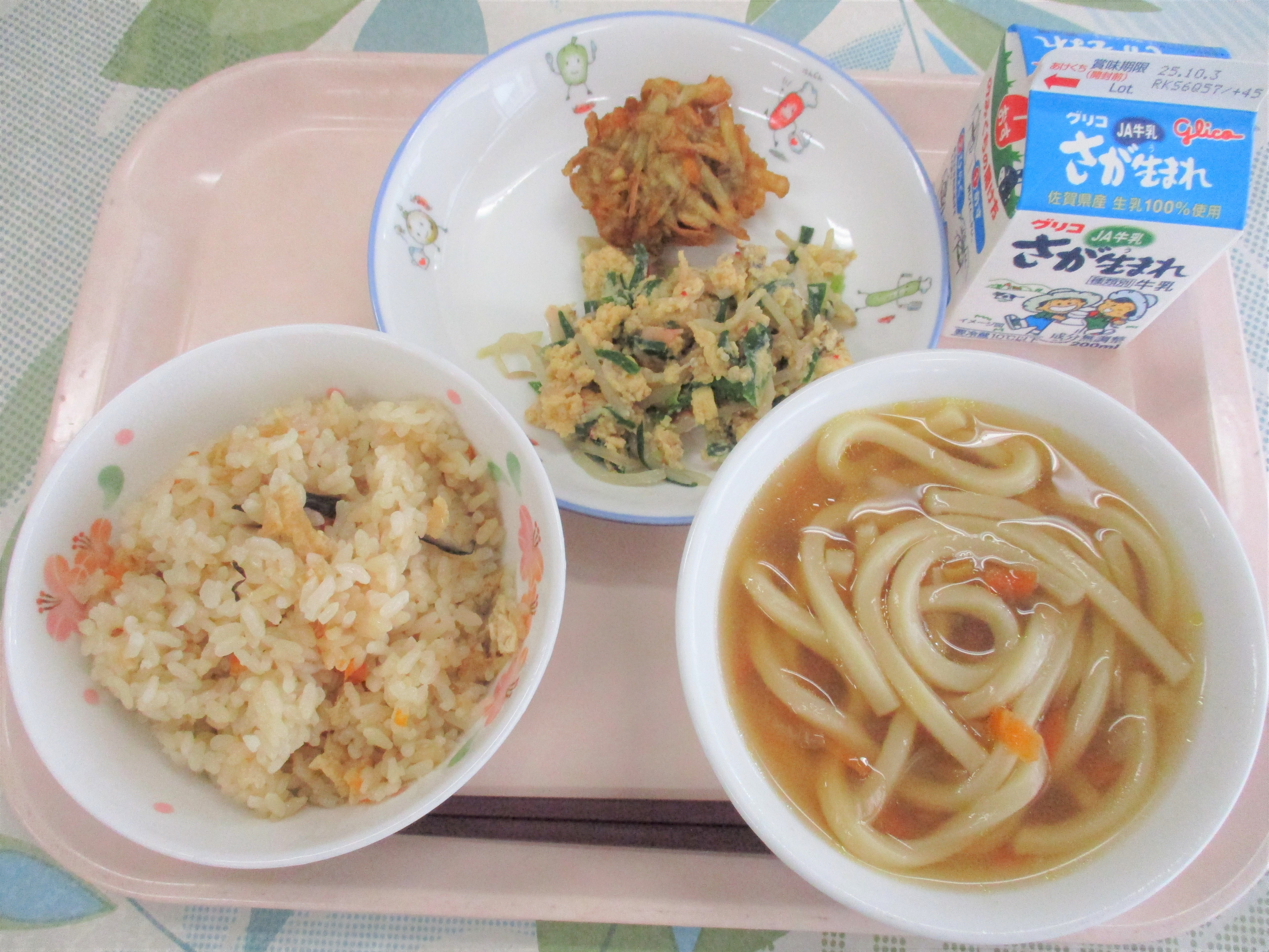 HOME > お知らせ > 今日の給食 > 9月22日(月)の給食 9月22日(月)の給食 入力日2025年9月22日 閲覧数47 献立名 炊き込みご飯 牛乳 ごぼうのかきあげうどん にら卵とじ 「うどん」について 「うどん」は、小麦粉 に塩水 を加 えよくこね、それを薄 くのばして細 く切 って作 ります。奈良時代 に中国 から伝 えられ、全国 に広 まるうちに、いろいろな形 に変化 しました。今日 は、うどんの上 に、パリっと油 で揚 げた「ごぼうかきあげ」をのせていただきましょう。 前へ 一覧へ戻る 次へ
