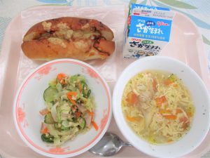HOME > お知らせ > 今日の給食 > 9月24日(水)の給食 9月24日(水)の給食 入力日2025年9月24日 閲覧数57 献立名 ピザドッグ 牛乳 クラッシュ大豆のサラダ トマトと卵のスープ 「ピザドッグ」 今日 は、イタリア料理 で有名 な「ピザ」をイメージした「ピザドッグ」です。ピザドッグは、給食室 で玉 ねぎ、ピーマンを炒 めてソースを作 り、パンの切 れ目 に、そのソースとソーセージをはさんで、チーズをかけてオーブンで焼 きました。一 つ、一 つ心 をこめて作 りました。調理員 さんの愛情 たっぷりのピザドッグです。味 わってたべてください。 前へ 一覧へ戻る 次へ