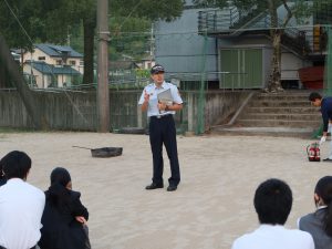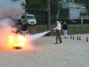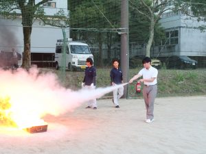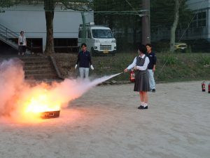 避難先の運動場東側において、クラス代表生徒8人が消火器を使っての消火訓練を実施しました。それぞれ「火事だ~!」と周りに知らせるために叫びながら、素早く消火してくれました。消火のコツを掴んだ生徒もいたようで、貴重な体験となりました。また、訓練後の防災講話では、動画を見て、「火災時の煙には姿勢を低くして、煙を吸い込まないように移動する」ことの大切さを学びました。御協力いただいた有田消防署・西部消防(株)の職員の皆様、誠にありがとうございました!