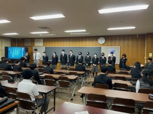 会の最初に、馬場校長先生より開式の挨拶があり、その中で旧生徒会執行部の皆さんへ労いの言葉が送られました。続いて、旧生徒会執行部のセラミック科4年で生徒会長を務めた大塚君より挨拶があり、旧生徒会執行部の一人ひとりが順に挨拶を行いました。