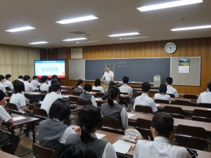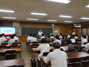 式ではまず校長先生による訓話があり、生徒たちに向けて、日々の努力の積み重ねや継続することの大切さについてのお話がありました。その後、教務部、生徒指導部、進路指導部、保健厚生部の先生方から、前期の振り返りとして、生徒の皆さんが前期に頑張った点や学校生活における注意点などが伝えられました。あわせて、10月から始まる後期に向けての心構えについてもお話がありました。