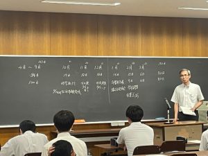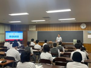 始業式では、まず永益教頭先生より訓話があり、前期の振り返りと後期に向けての意気込み、そして残り半年間をしっかりと頑張るようにとのお話がありました。続いて、教務部および生徒指導部からの講話が行われました。