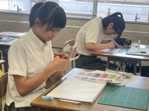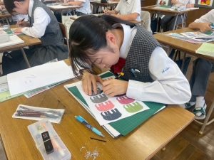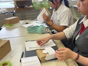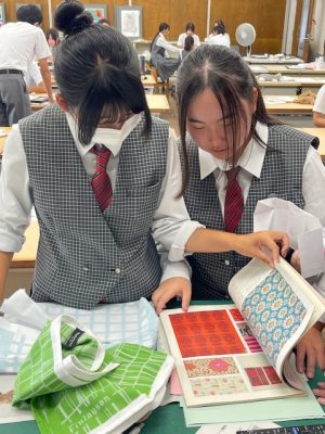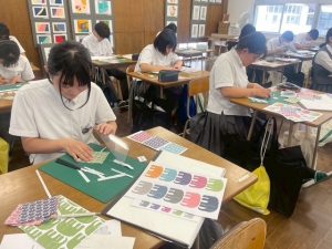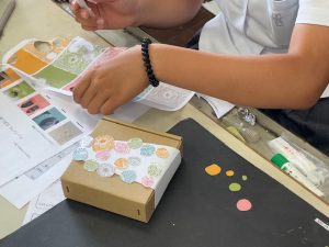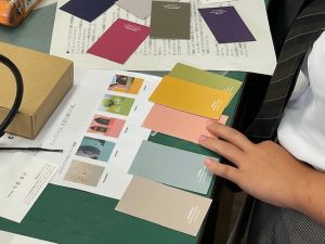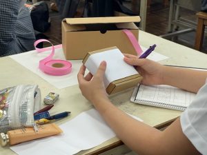 2年生は、今回のフェアで有田とコラボする商品となる豆皿を入れる箱を包むスリーブ状のパッケージです。フィンレイソンのブランド感を損なわないように注意しながら、事前に資料としていただいた実物大の箱を相手に試行錯誤が続いています。なかなか苦戦していますが、素敵なパッケージができつつあります!【1年生】