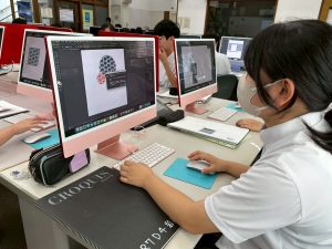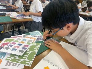 1年生はフィンランドフェアで配布する来場者向けのステッカーが課題です。サイズは小さいのですが、手に取るお客様がどうやって活用するかなどを想像してデザインを工夫します。なにより定番素材のエレファンティ(象)をモチーフにするので可愛らしい!最初は紙を使って試作するところから始めて、最後にMac上でイメージ通りのデータにして仕上げました。
