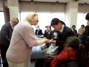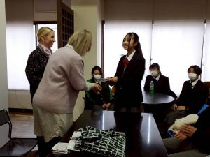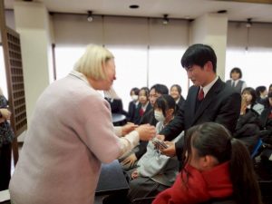 オスミさんたちは、些細な質問にも丁寧に、笑顔で応えてくださいました。最後に、今回のパッケージやステッカーのデザインで最終選考に残った生徒たちにフィンレイソンのオリジナルグッズをプレゼントしてもらいました。また選出の理由についてふれながら、デザインが、来場(来店)する人、買う人の気持ちにどういう段階で商品の魅力を訴えかけるかというマーケティングの大事さについてお話しいただきました。