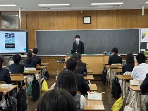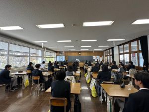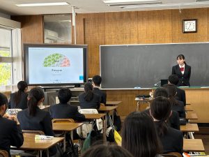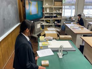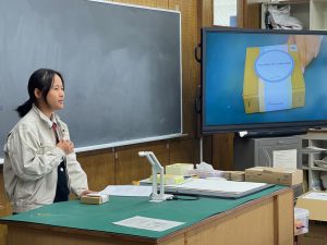 2年生は今回のフェアで企画されたオリジナル商品の豆皿を入れる箱をご提供いただいたので、ダミー(パッケージの試作品)を作る必要がありました。単純に箱を包む帯状のデザインを考えるだけでなく、展開図を考え、実寸のパッケージを作るのはなかなか大変です。完成したダミーを書画カメラで映しながらプレゼンテーション形式の合評を行いました。みんな工夫を凝らしたデザインに仕上がりました!