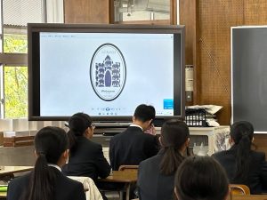 1年生が取り組んだフィンランドフェアで配布するステッカーデザインは、最終的にデジタルデータ作成したので、電子黒板を使って合評会を行いました。10㎝四方の小さなデザインに込めた思いをそれぞれが話してくれました。