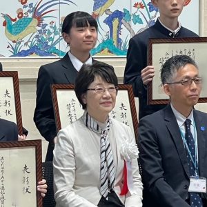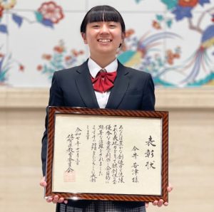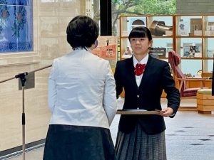 いつも快活な今井さんもさすがに緊張気味で、県庁に着いても落ち着きません。ですが、いざ本番ではしっかりした所作で甲斐教育長からの表彰を受けてくれました。表彰が終わるとすっかりいつもの笑顔を取り戻して、大きな名尾和紙製の賞状を、目を細めて見ていました。みらい留学で鹿児島県からやって来た今井さん、「家族がとても喜んでくれていて、早くこの賞状を見せてあげたいです」と話してくれました。