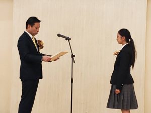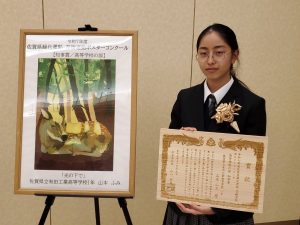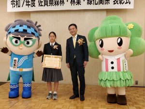 去る11月19日(水)、佐賀市のグランデはがくれで、令和7年度佐賀県緑化運動・育樹運動ポスターコンクール表彰式が行われました。本校からデザイン科1年の山本ふみさんが、高等学校の部で知事賞を受賞し、出席しました。