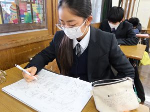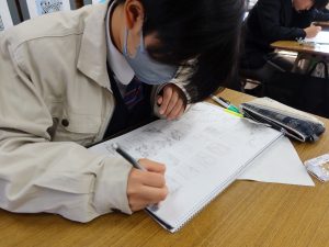 これまでの実習で学んだ知識や技術を生かして幾何学的な形や線、配色などを工夫してポスターを構成するのですが、本日、御紹介するのはアイデアスケッチに取り組む生徒たちの様子です。