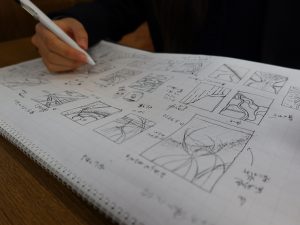 何かをつくり出す時にはよく「生みの苦しみ」という言葉が用いられますが、作品制作においてアイデアスケッチはそこにあたります。どの生徒も頭を抱えながら、自身の作品がより良くなるように何度も何度もセクションノートにアイデアスケッチを描いていました。2学期の間に下描きまで行い、絵の具での制作は冬休みの課題となります。