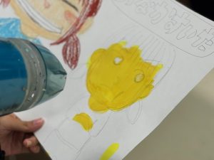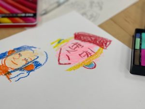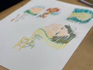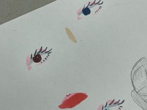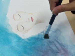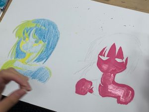 今日は2年生の準備を御紹介します。実習ではこのポスター原画を手掛けるまでにやっておきたいことがあります。それは「いろんな表現と技法を体験する」ことです。具体的に言うと、今までの線や色を塗る過程以外の作品に挑戦します。今回のテーマは「顔」です。表情、感情の違いを強調したり、色や線の変化で表現します。色についても一つの色を美しく塗ることが多かった今までの課題と異なり、色の層をつくったり、わざとカスレや滲みをつくる面白さを体験します。