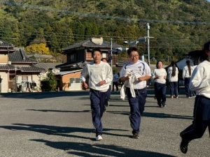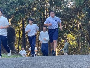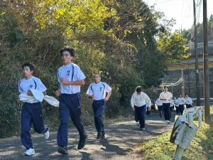 短縮校時の授業を終えて、一斉にスタート、長い距離になるので隊列は必然的に長くはなりますが、参加した生徒全員冬の日差しに体を温めながら走り続けます。ゴール時には上着のトレーナーを脱いで戻って来る生徒も多くいました。