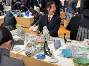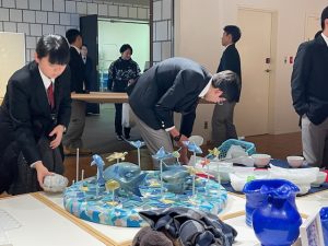 明けた1月26日(月)は搬出日です。搬入のとき同様、ホームを終えたセラミック科とデザイン科の3年生は氷点下の道のりを、一路会場の九州陶磁文化館へ向かいます。飾付けに比べると時間はかからない撤収作業ですが、来た時よりも美しくをモットーに、てきぱきと作品を梱包したあとは展示台や机を元の場所に収納しました。電気科は、班ごとに時間をずらして撤収にあたりました。何かとお気遣いいただいた九州陶磁文化館のスタッフの皆さまにも改めて感謝申し上げます。