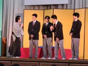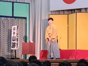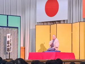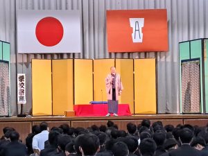 休憩を挟んで、太神楽曲芸では、顎の上に棒を立て、その上に茶碗や房の付いた板が積み上がります。見事なバランスに息をのみました。またこちらも体験コーナーが催され、6名の生徒が志願しました。回る傘の上に玉を転がすのですが、これは苦戦しました。最後に枝太郎様の落語を堪能しました。演目は「初天神」。解説を聞いたり実際にやってみたりした後だったので、話の内容はさることながら語り口の面白さ、巧みさに引き込まれました。また、終演後の「身近な体験の中にチャンスがある」という言葉も印象的でした。