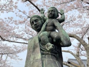 さて先週末のニュースでも桜の開花をお伝えしましたが、土曜日曜を経てすっかり満開の様相になりました。今日の天気は、少しぼんやりした春霞のような一日でしたのであまり鮮やかには映りませんが、有工自慢の中庭の一本桜と、玄関前のLove&Peace像を彩る桜が撮れましたので、在学時を思い出していただければ幸いです。Love&Peace像は旧校舎時代には校門をくぐったところにあった池の真ん中に据えられていました。平成以降の今の校舎で、像の背景に桜が見られるようになったのです。