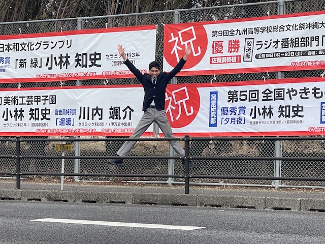 小林さんは、11月の日本和文化グランプリで学生最優秀賞を高校生で初めて受賞したことが話題となり、テレビなどの取材が相次ぎました。東京からの地域みらい留学生ということも興味を増す一因になったようです。先日も「第5回全国やきもの甲子園2026」で優秀賞を受賞し、新たに横断幕で祝福したところでした。そんな彼をぜひ「地域みらい留学」の視点で深堀りしたいとオファーがあり、今回の出演となったのです。聞き手はプラットフォームの専務理事で地域みらい留学事業の責任者でもある尾田洋平さんです。