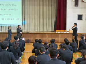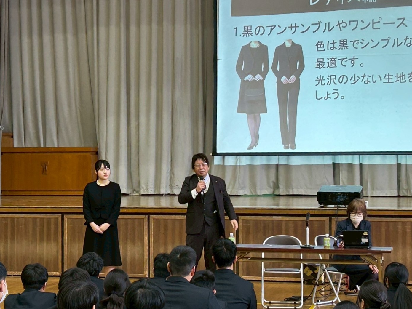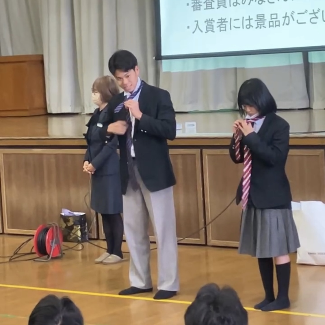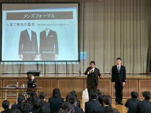 服装や小物についてのポイントを教えていただき、社会人に向けて勉強になりました。また、各クラスの代表が出て、ネクタイを美しく結ぶ『ネクタイコンテスト』も行われ、大いに盛り上がりました。