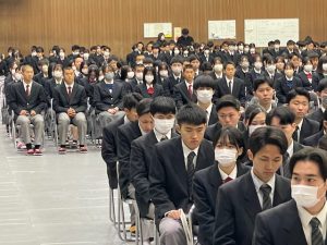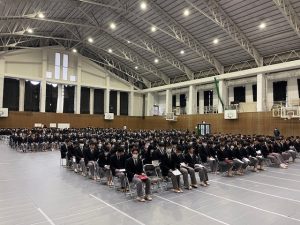 28日には全校生徒が体育館に集まり、3年生の最後の表彰も行われました。3か年皆勤や精勤、ジュニアマイスター、単年度の賞など、こつこつと3年間頑張ったことについて拍手が送られました。ふるさと検定等の校内表彰から知財甲子園、意匠登録証の紹介など、最後まで頑張り続ける先輩の背中を見せてくれました。