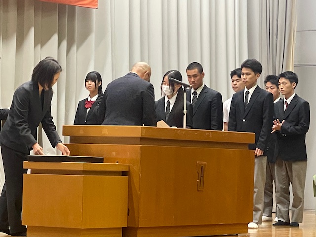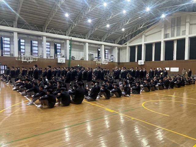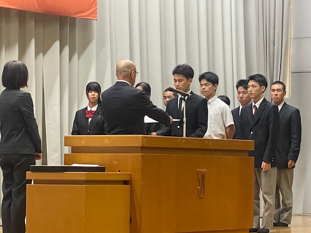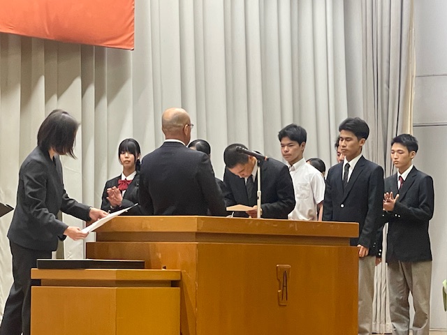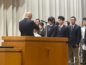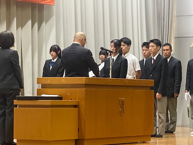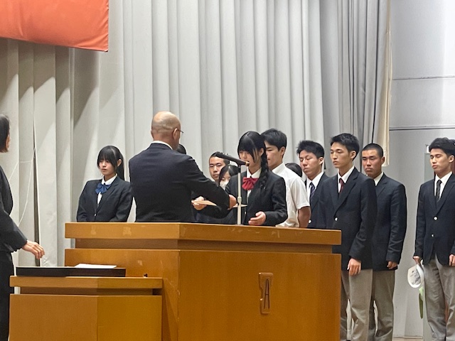 4月9日(木)、2、3年生は授業が始まり、1年生はオリエンテーションが行われていたこの日、前日の対面式に引き続き、午後から全校生徒が体育館に集まりました。この日は、新年度最初の表彰伝達式です。今回の表彰伝達は、昨年度の1か年皆勤、また基礎力テストの成績が優秀だった生徒の表彰です。これを年度当初に行うのは、入学したばかりの1年生に、頑張った先輩たちの姿を示して、自分の目標を具体的に設定する助けになればとの思いからです。