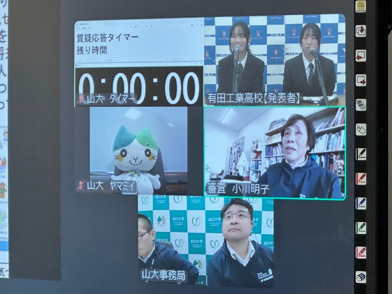 発表は事前に収録したものを配信先から再生し、審査員からの質疑をライブで行う流れです。10番目に発表した江口さんは「今回制作したものは実際に使っていただけるとのこと、子どもたちにアートが身近になっていくと嬉しい」と結びました。トリの14番目に前田さん、山口さんは発表し、「暮らしてきた町が大好きな私たちは、学んだデザインで活気が生まれることを期待しています」と話しました。