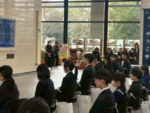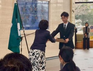 挨拶では、「地域みらい留学で東京から佐賀の地にきたこと。中学までの人生は自分の嫌なこと(学校、部活、塾、習い事)から逃げてばかりだったこと。セラミック科でやきものについて正面から向き合ってきたこと。これから自分の選択に対して納得できるかが重要。今後、大学生になっても自分の納得できる選択肢をし、選んで良かったといえる行動や努力をしていきたい。」といった言葉を落ち着いて述べ、その後、表彰、記念撮影等が行われました。