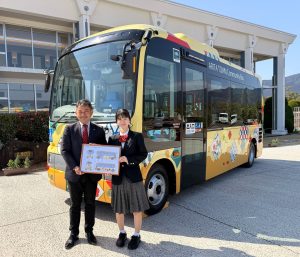 これに併せ、昨年に引き続き更新された、有田町のコミュニティバスがお披露目になりました。新たにラッピングデザインが昨年の夏に募集されており、採用になった中島愛莉さん(D3・卒)のデザインが公開されました。