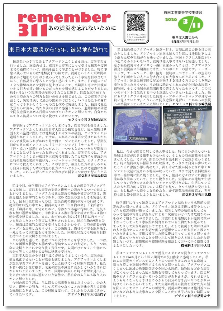 生徒会では、15年間発行を継続している「remember311」を本日発行、生徒たちに改めて震災を通して防災意識を高める呼びかけを続けています。