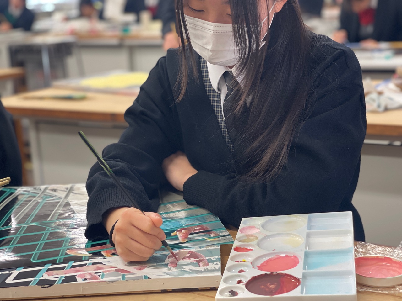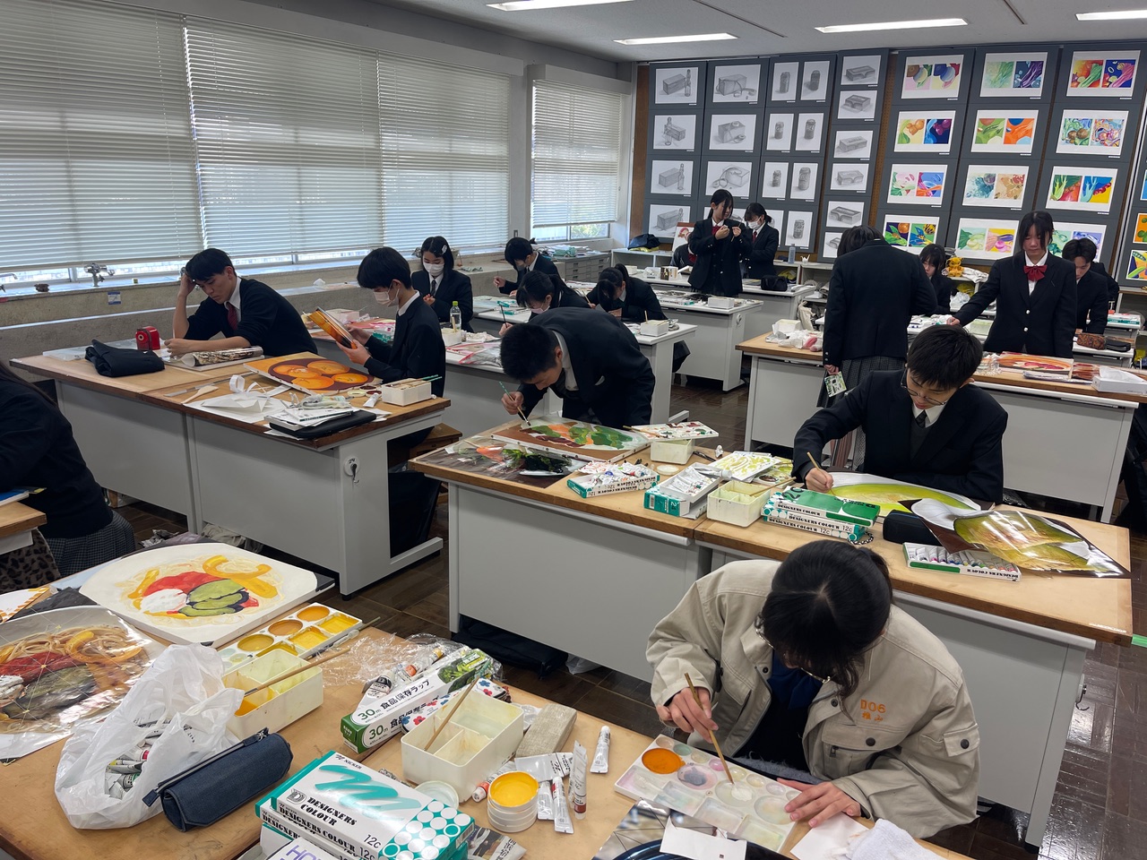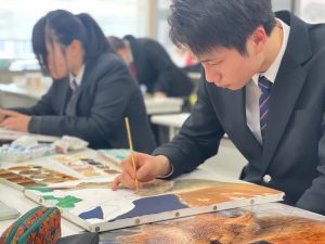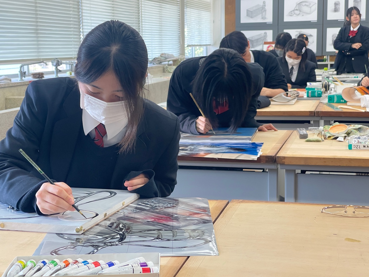 2年生は「精密描写」がテーマ。写真を元にはしますが、B3サイズのパネルに不透明水彩をはじめ、いろんな画材や描画法で「リアル」を追求します。考えただけでも大変そうな課題なのですが、「あ、なんだか描けた気がする!」と思えてくると楽しいのだそうです。裏を返すと、そこにたどり着くまではかなり苦しいのですが・・・。