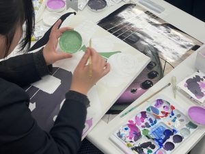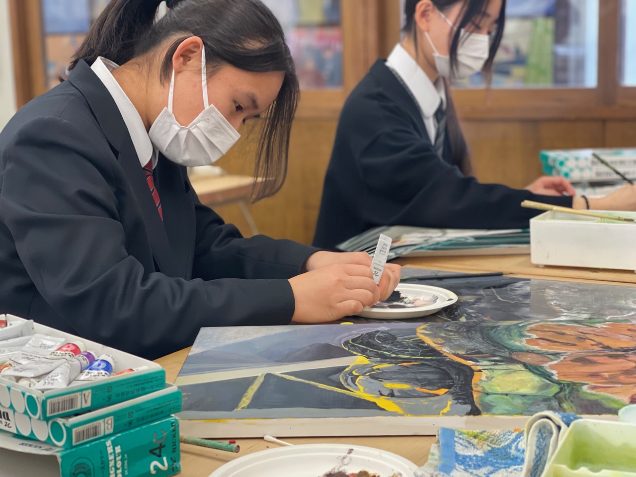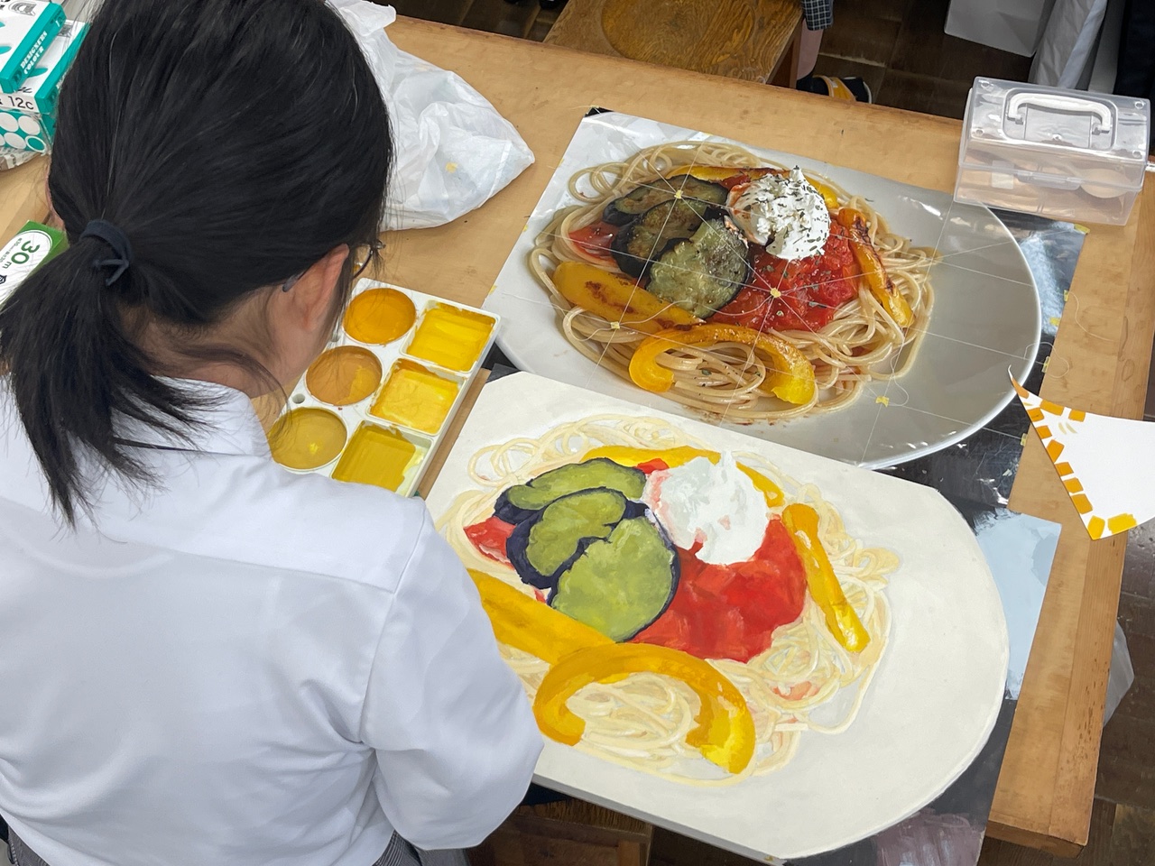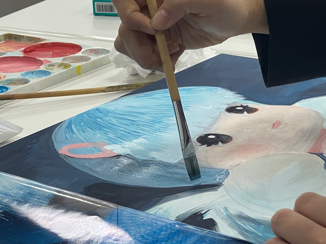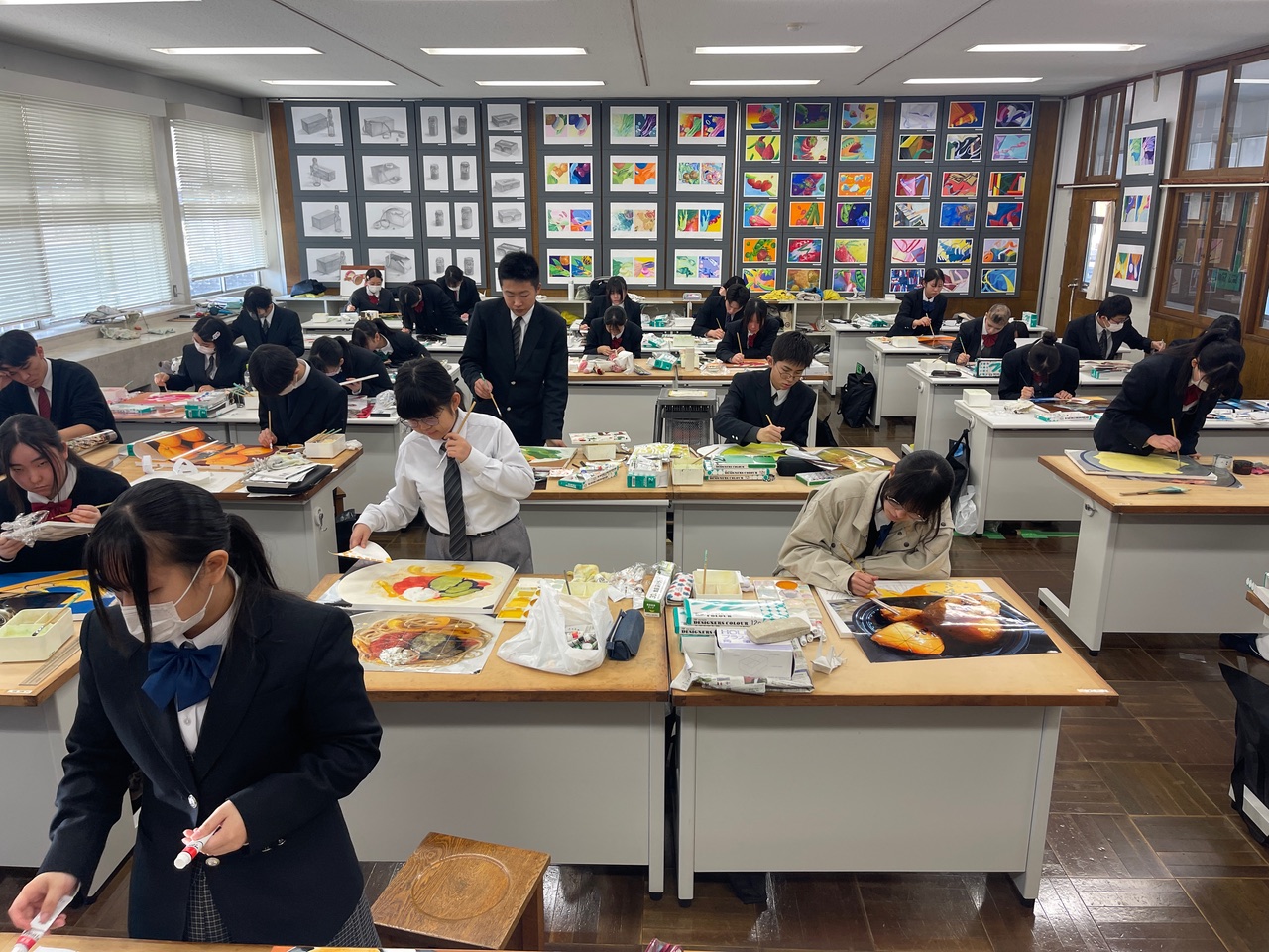 2年生は「精密描写」がテーマ。写真を元にはしますが、B3サイズのパネルに不透明水彩をはじめ、いろんな画材や描画法で「リアル」を追求します。考えただけでも大変そうな課題なのですが、「あ、なんだか描けた気がする!」と思えてくると楽しいのだそうです。裏を返すと、そこにたどり着くまではかなり苦しいのですが・・・。