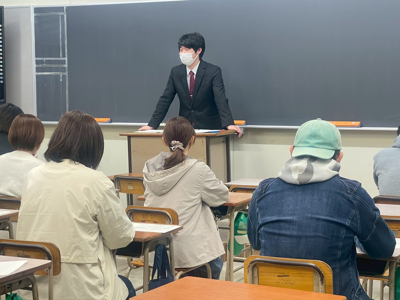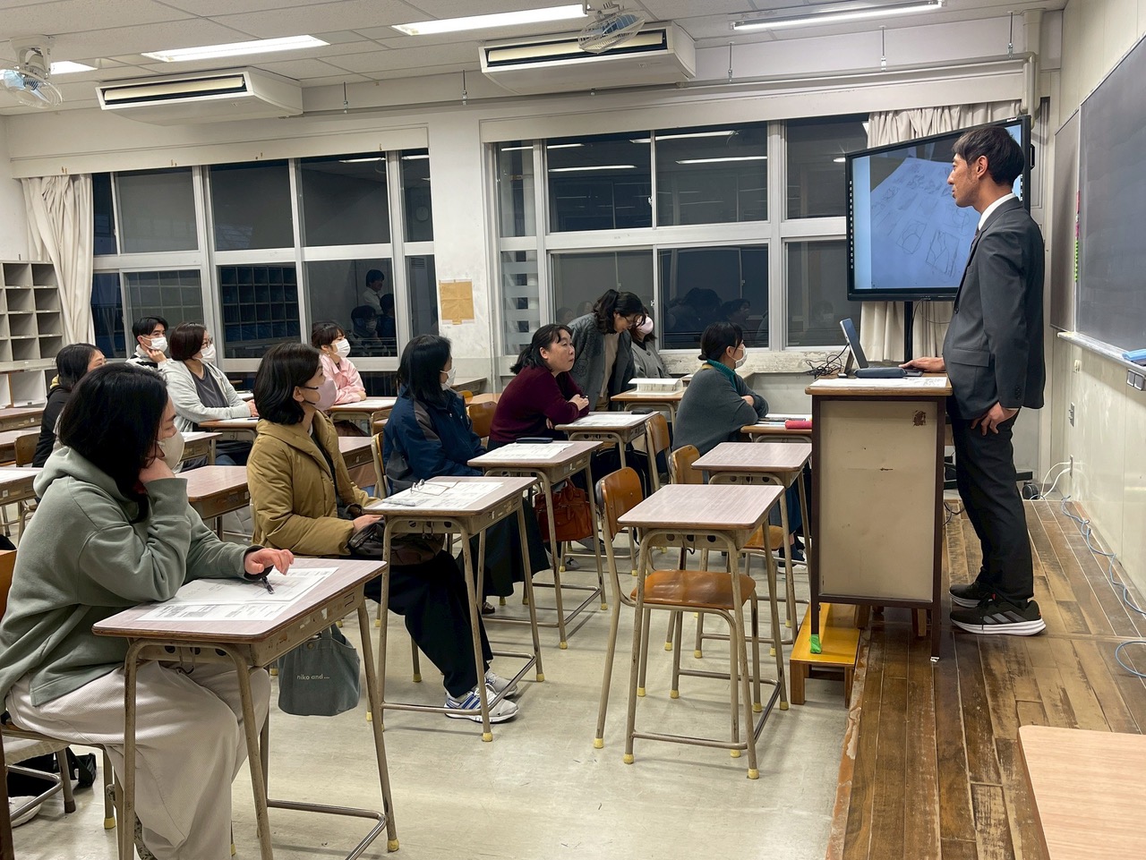 居残りの生徒たちと一緒に実習室を見学する保護者さん