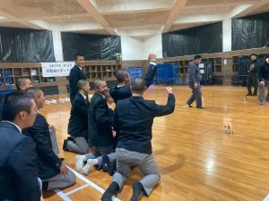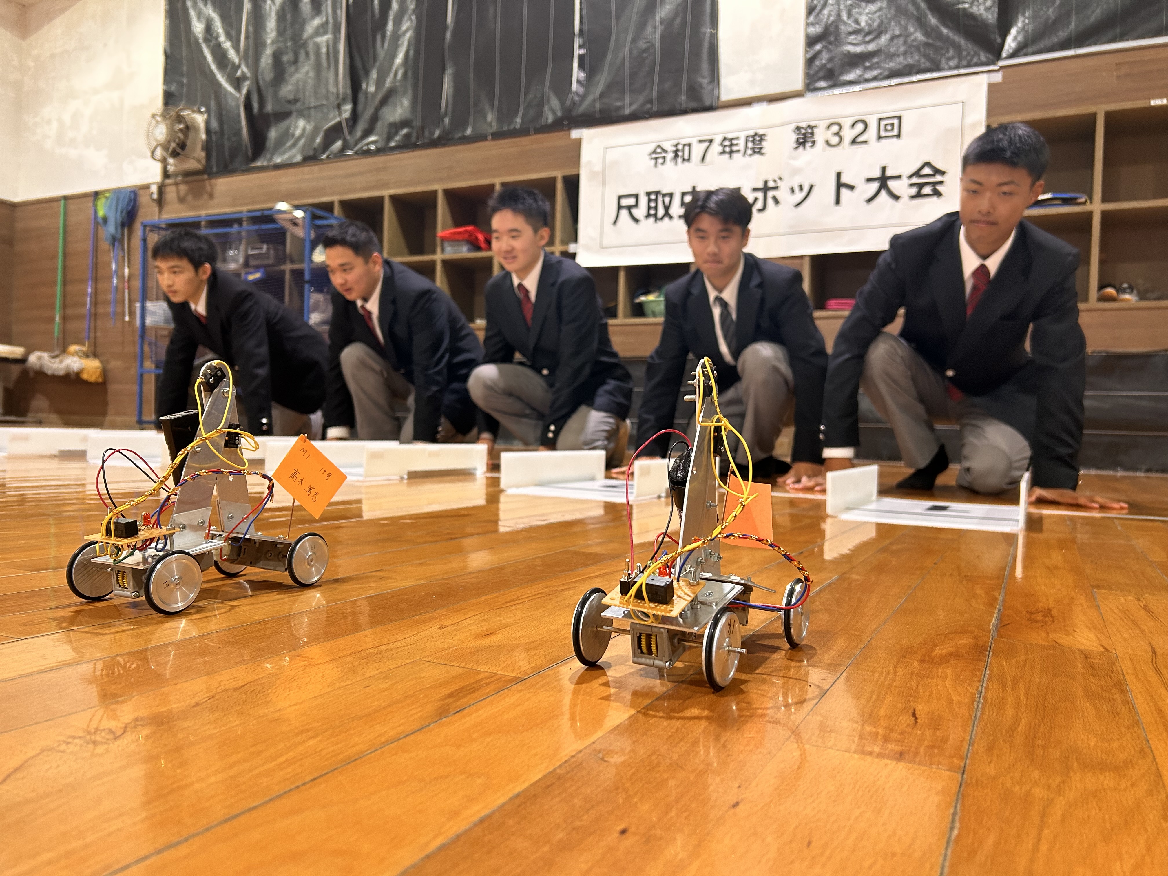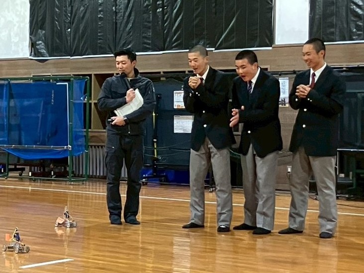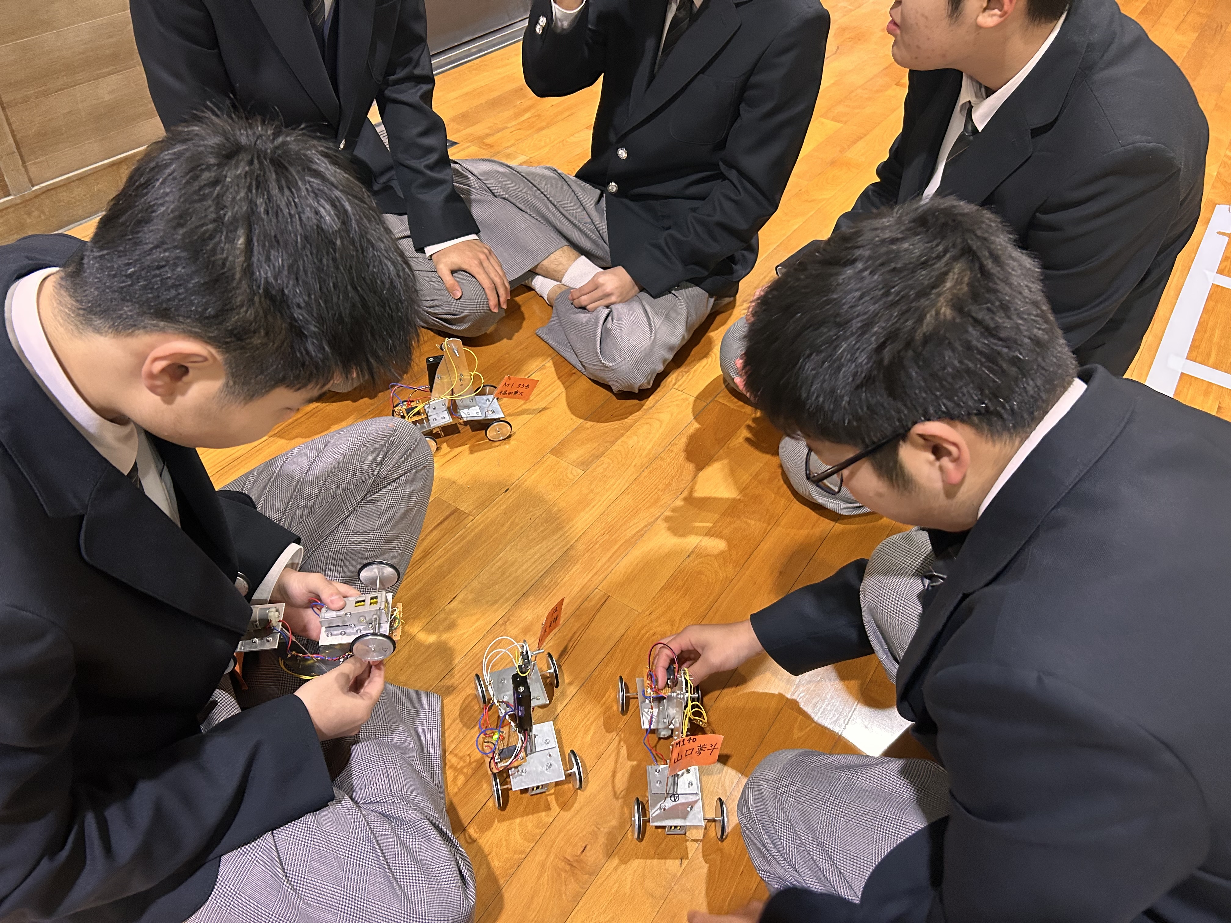 大会は各組4名で行う予選から準決勝、決勝と、各ブロックを勝ち上がっていく方式です。出走直前まで調整や修理を行いながらも、ロボットが不調に見舞われ思ったような走りができないものもいくつかあり、残念そうな生徒もいました。それでも勝ち上がったクラスメイトのロボットに大きな声援を送るなど、全員が一体となって大会を盛り上げてくれました。