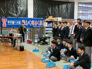 3月13日(金)、機械科1年生による尺取り虫ロボット大会を開催しました。尺取り虫ロボットは、2つのスイッチ・モーターを使用して、その名の通り尺取り虫のように進む4輪型のロボットです。この大会は1年生が機械実習の集大成として取り組むもので、約4カ月かけてロボットを制作し、その成果を競うため毎年学期末のこの時期に実施している恒例行事です。