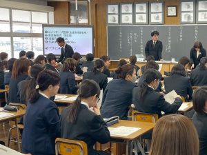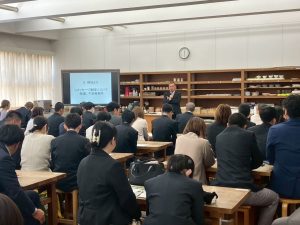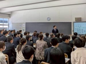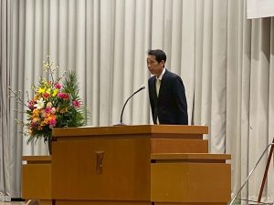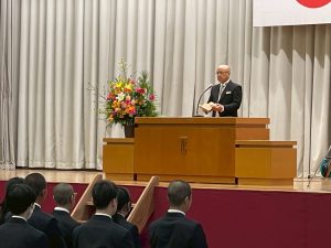 続いての式辞で馬場校長先生は、「決して長くない3年間(4年間)を大切に歩んで」と有工生活の門出に言葉を贈りました。祝辞では有田町の吉永教育長様、全日制PTA会長の筒井様からお祝いのことばを頂戴しました。