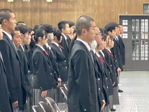 式はまず入学許可からです。馬場光弘校長先生から全日制138名、定時制10名の有田工業高校への入学が正式に認められました。