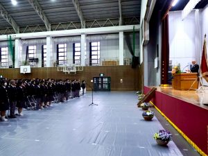 曇り空ではありますが、昨夜半に降った雨はあがりました。8時45分の受付には多くの入学生と保護者が来校され、体育館に集まりました。体育館では担任をはじめ、科の職員が新入生の席を案内します。来賓の方々も着席され、いよいよ開式です。