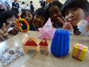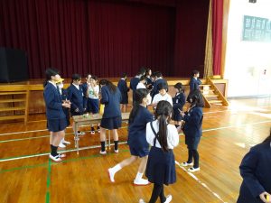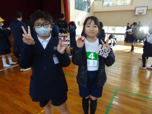 HOME > 学校行事のようす > 学校行事のようす > クリスマスパーティ最終日 クリスマスパーティ最終日 入力日2025年12月18日 閲覧数7 今日の昼休みは体育館で6年生主催のクリスマスパーティが行われました。 今日は最終日でした。 体育館でビンゴ大会が行われ、6年生手作りの景品をプレゼントされました。 子供たちと一緒に教師も楽しみました。 景品はどれも力作でした。 下級生たちはもらった景品を見せ合いながら、「これもいいね。」「かわいいなぁ。」などそれぞれ嬉しそうに話していました。 前へ 一覧へ戻る 次へ