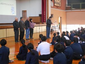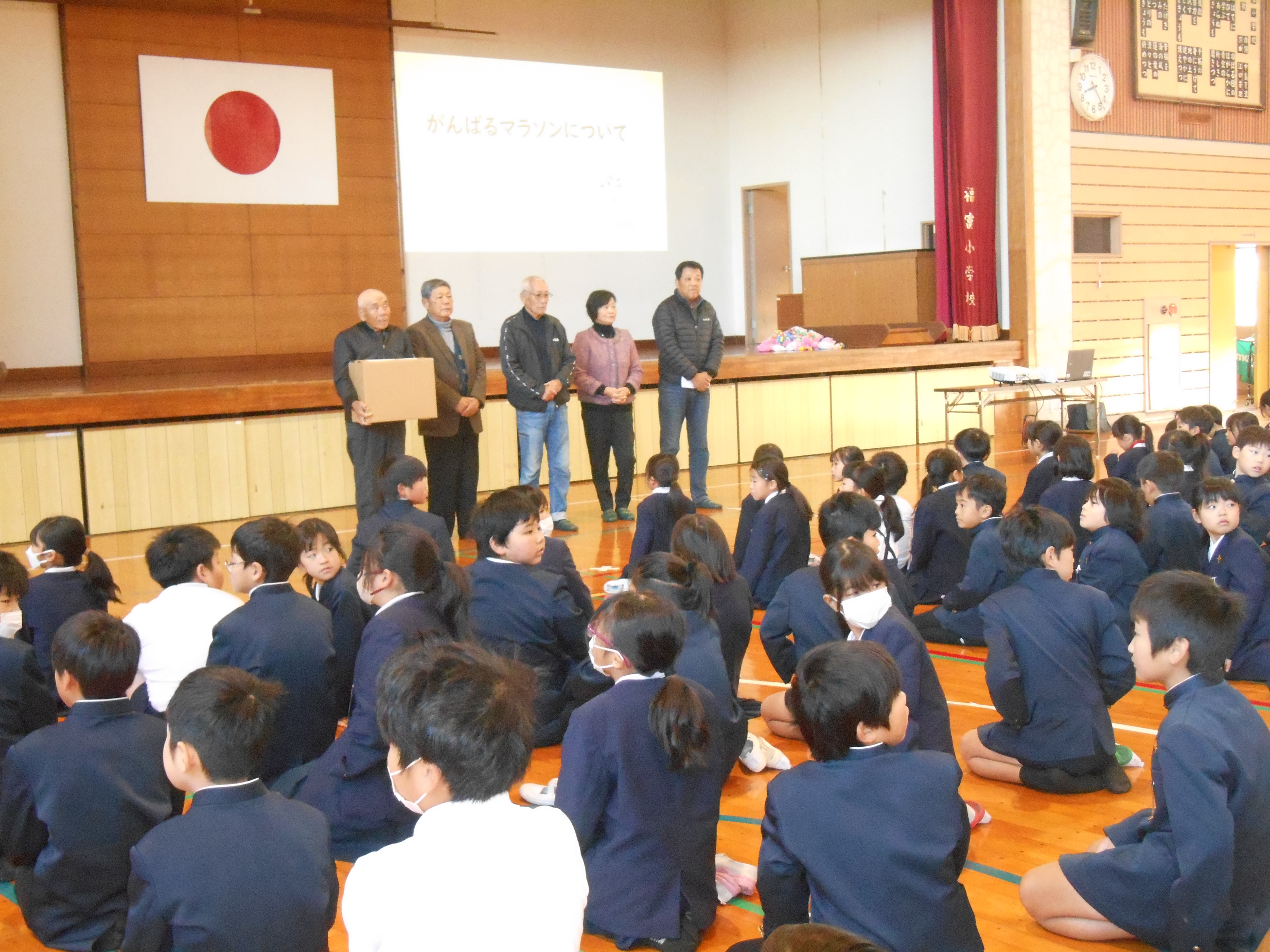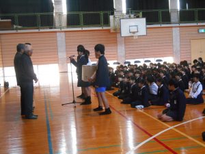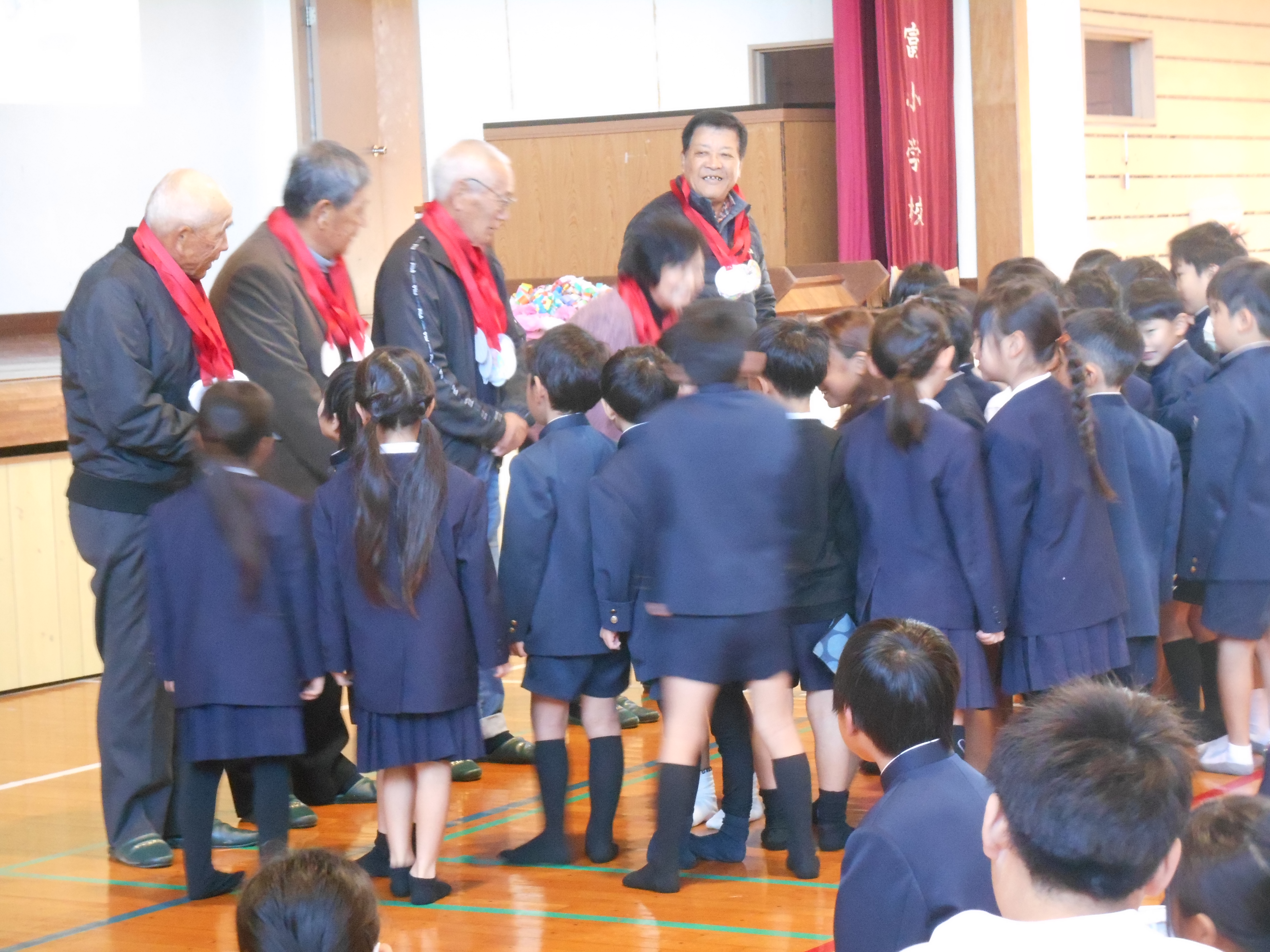 12月9日(火)の朝の時間に、福富地域老人クラブの皆様より、子どもたちに220枚の手作りぞうきんを頂きました。9地区の老人クラブの皆様が、毎年子どもたちにぞうきんをくださっています。9日は、老人会の方を代表して5名の皆様が来校してくださり、代表の上野様が「このぞうきんで1年の汚れを落として、新しい年を気持ちよく迎えてください。」と話されました。今年は、1年生からのお礼のメダルプレゼントがありました。老人クラブの皆様の心のこもったぞうきんを大切に使って、学校をきれいにしていきます。老人クラブの皆様、本当にありがとうございました!