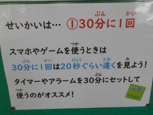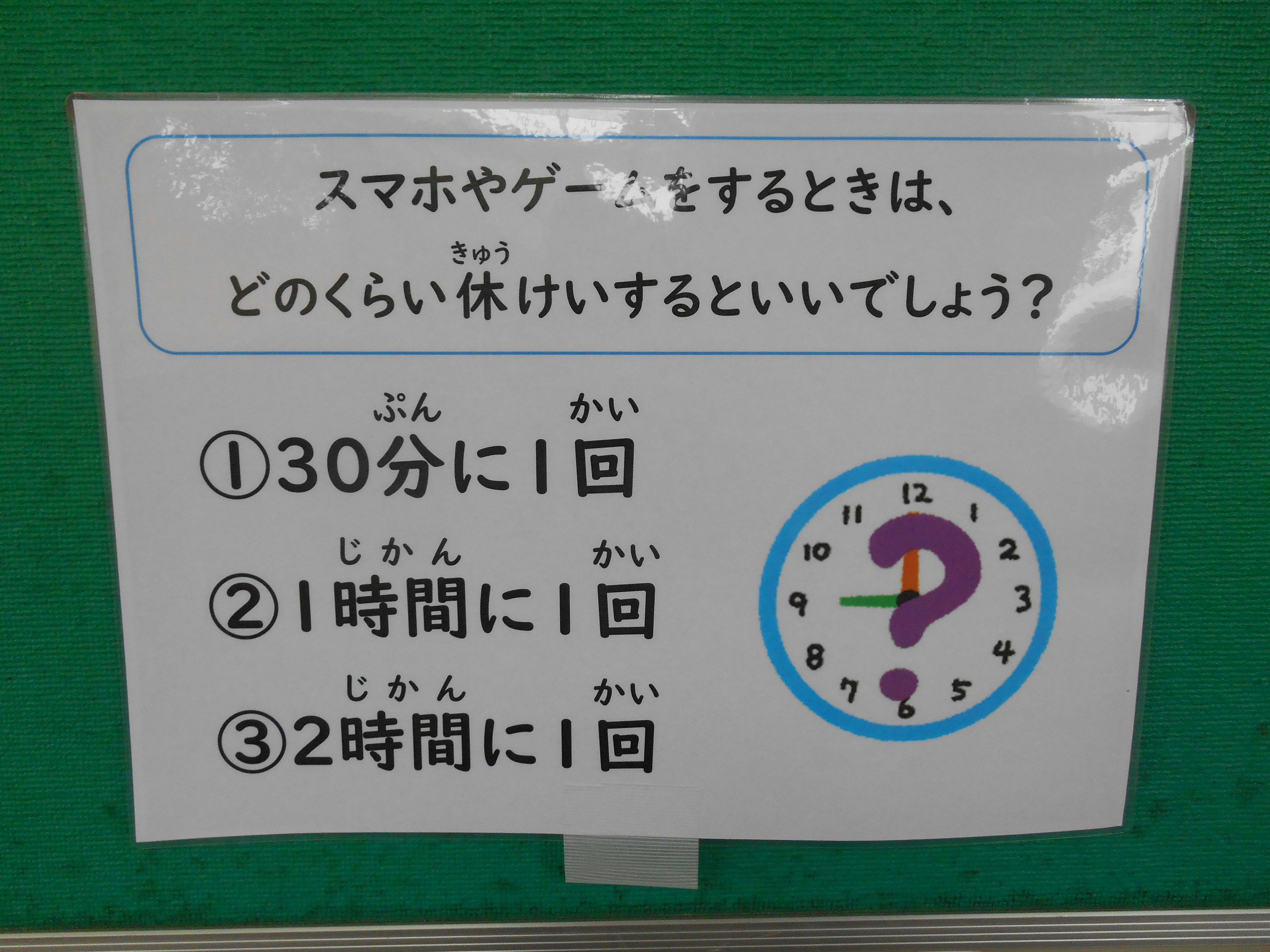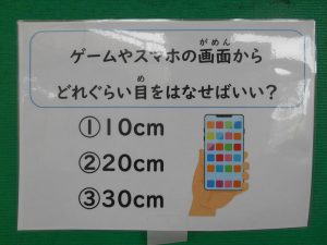 HOME > 福富っ子活動 > 児童の活動紹介 > メディアクイズの答え メディアクイズの答え 入力日2025年9月25日 閲覧数3,239 保健室前の掲示板に「メディアクイズの答え」が示されていました。9月の発育測定時のクイズの正解が記されたものです。「ゲームやスマホの画面からどれくらい目を話はなせばいい?」「ゲームやスマホをするときはどのくらい休憩すればいいでしょう?」等のクイズでした。子どもたちには、ゲームやスマホのルールをしっかり決めて、適切に使ってほしいという願いが込められています。 前へ 一覧へ戻る 次へ