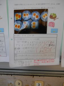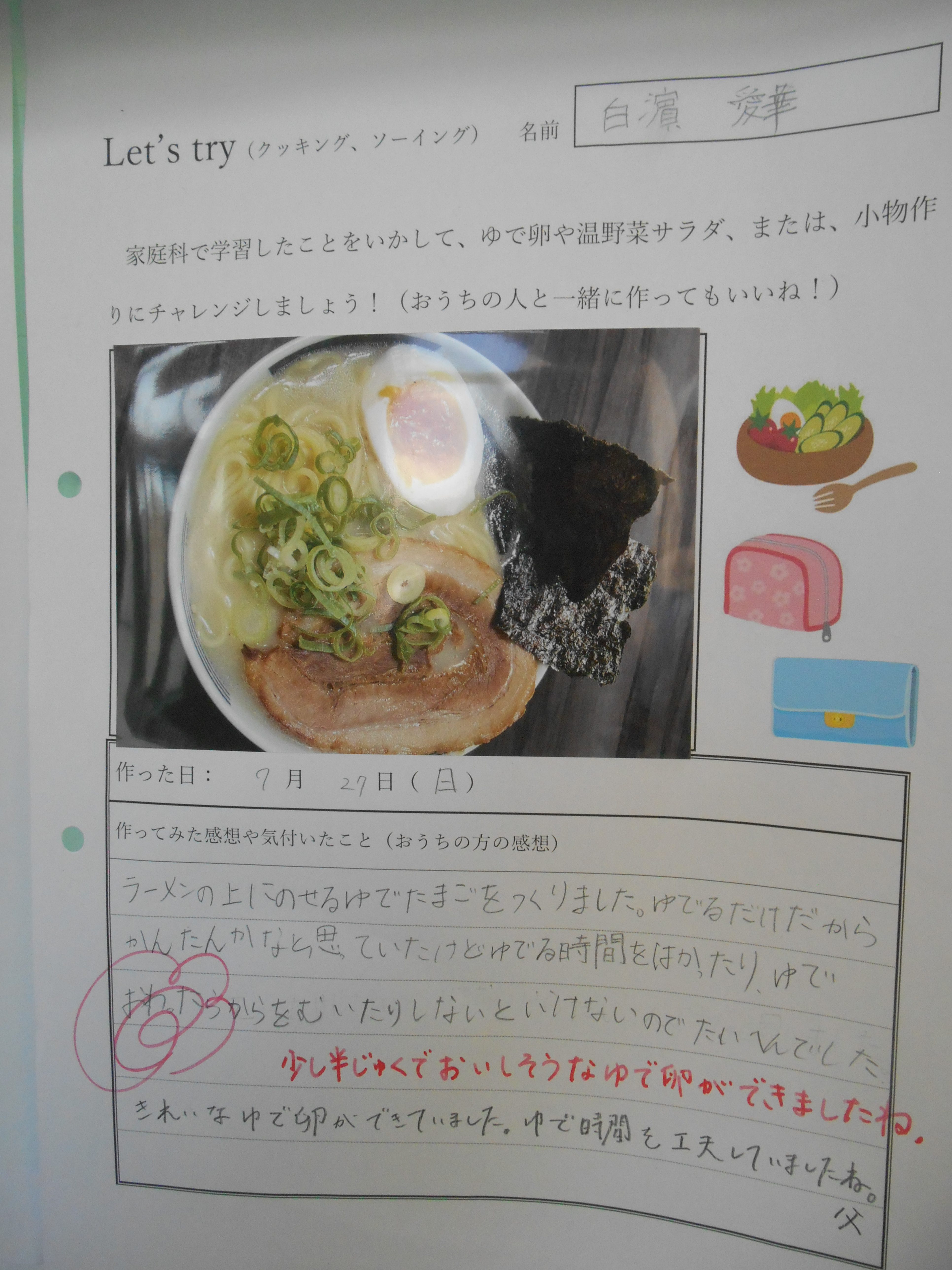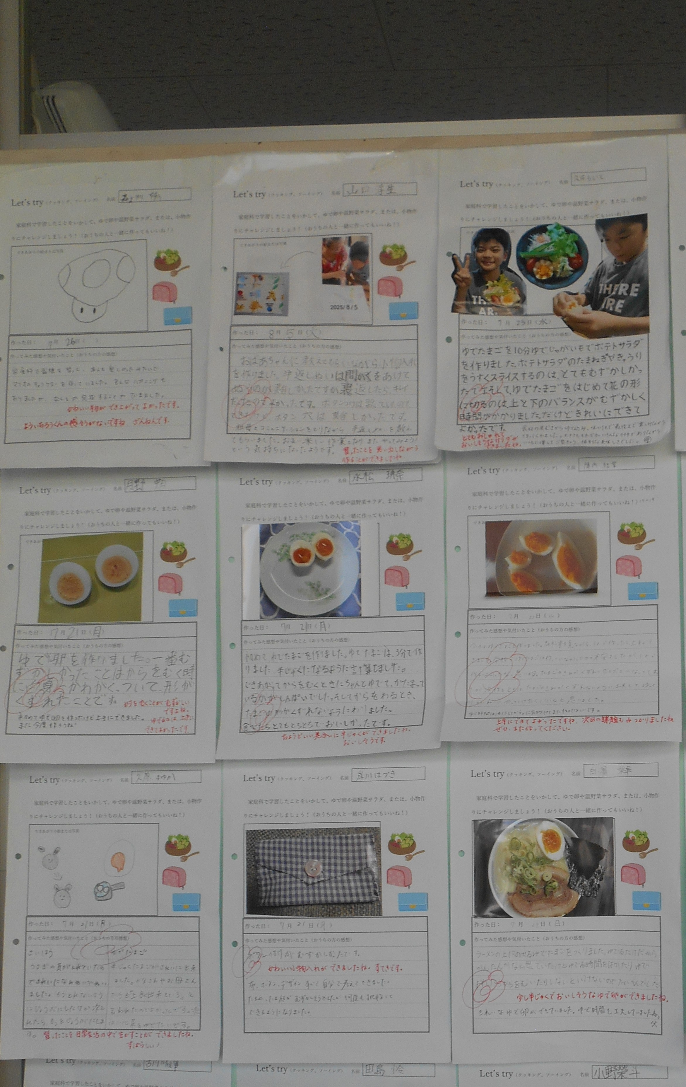 HOME > 福富っ子活動 > 児童の活動紹介 > 夏休み家庭科チャレンジ! 夏休み家庭科チャレンジ! 入力日2025年9月19日 閲覧数4,185 5年生の教室横には、子どもたちが夏休みに取り組んだ家庭科チャレンジのカードが掲示してありました。1学期に学習した裁縫や調理にチャレンジしている様子が詳しく書かれています。ラーメンのゆで卵を作ったり、ゆで卵の加熱時間によって黄身がどのように変化するか調べたり、小物を作ったりと様々なチャレンジの成果が表現されていて感心しました。御家庭の御協力あってのことだなと感謝しております。ありがとうございました!! 前へ 一覧へ戻る 次へ