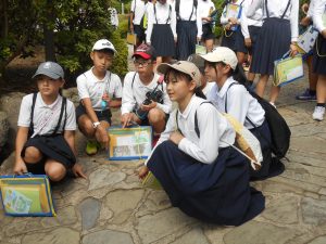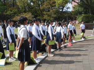 初めに城山小学校を見学し、平和公園を見て、原爆落下中心地で平和集会を行いました。その後、原爆資料館の見学、そして班ごとのフィールドワーク(浦上天主堂、一本柱鳥居、如己堂、山里小学校など)を行いました。その後宿泊ホテルにて、実際に原子爆弾の被害にあわれた八木先生のお話を聞きました。八木先生の「平和のバトンを受け取って、みんなに伝えていってください。」という熱いメッセージをしっかり受け止めていた子どもたちでした。