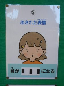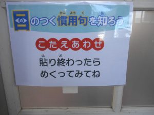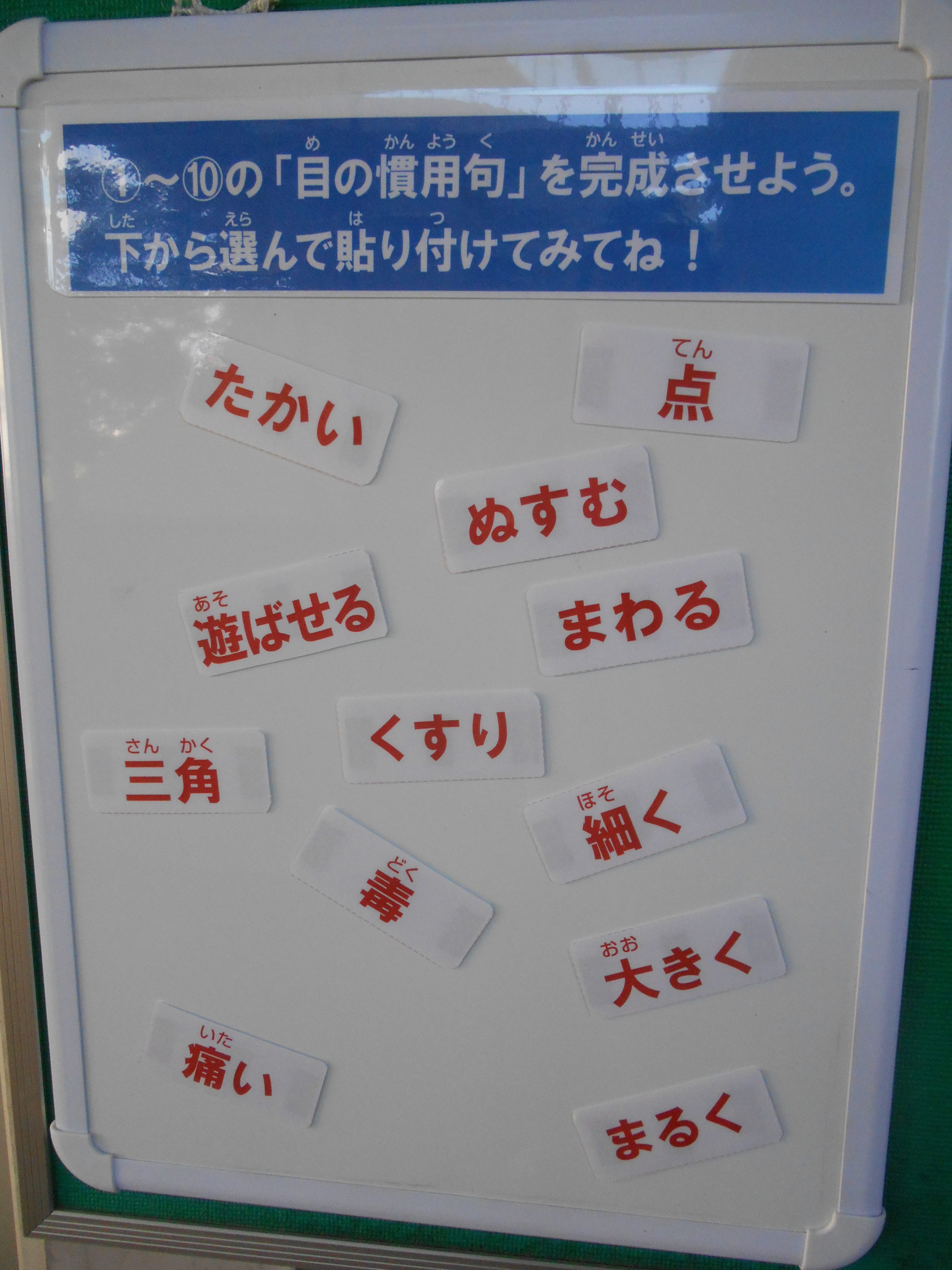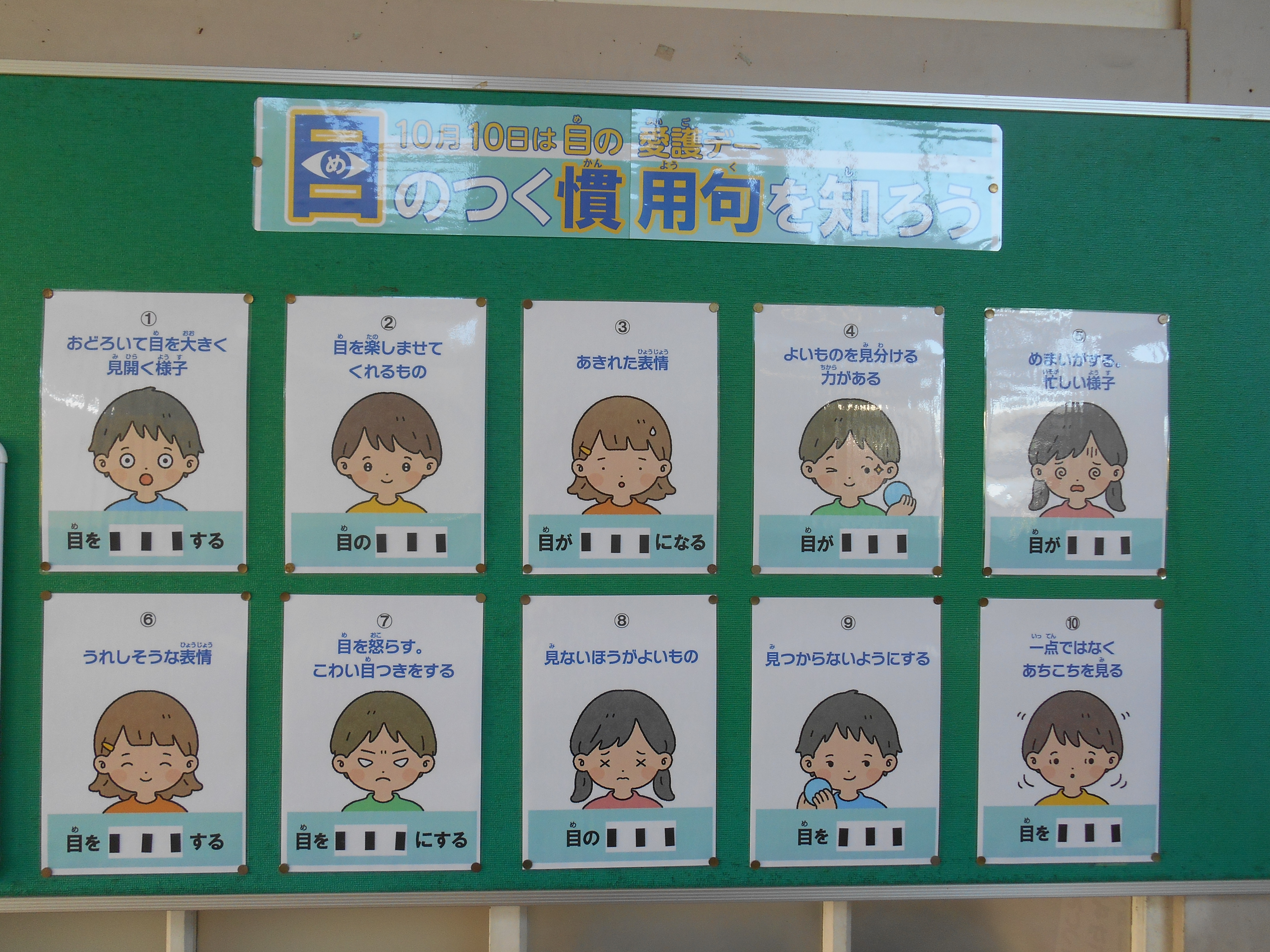 HOME > 福富っ子活動 > 児童の活動紹介 > 目のつく慣用句 目のつく慣用句 入力日2025年10月28日 閲覧数1,014 10月10日は目の愛護デー。「目のつく慣用句を知ろう」という保健の掲示板に子どもたちが注目していました。 カードの絵と慣用句の意味から、どんな言葉が入るか考えてそれを貼り付けていく形になっています。全部つけ終わったら、解答を見れます。 「目がまわる」「目をまるくする」「目が点になる」など目がつく様々な慣用句を知れる掲示板です。言葉の力も伸ばせる保健の掲示板、すてきだなと思います。 一覧へ戻る 次へ