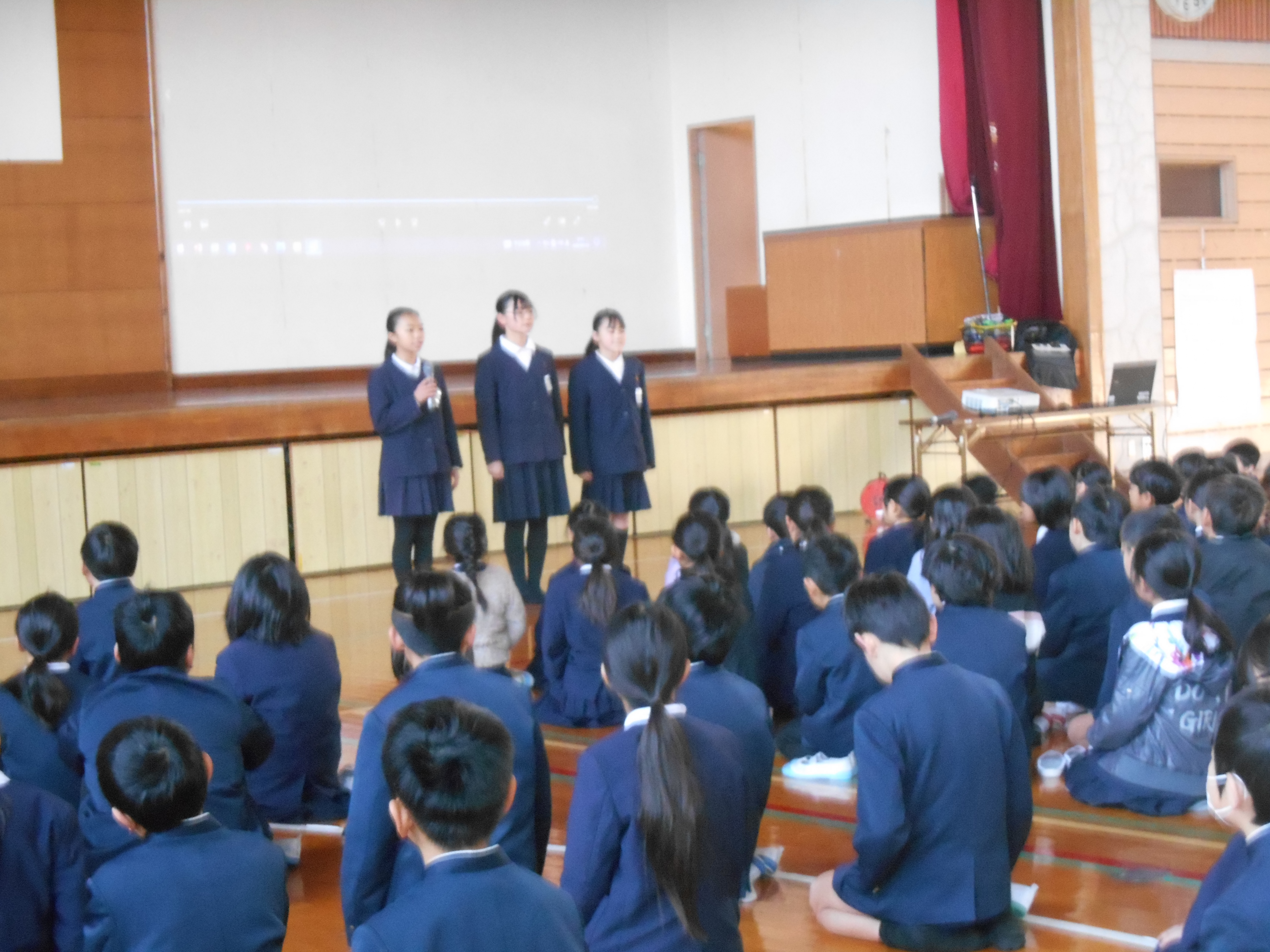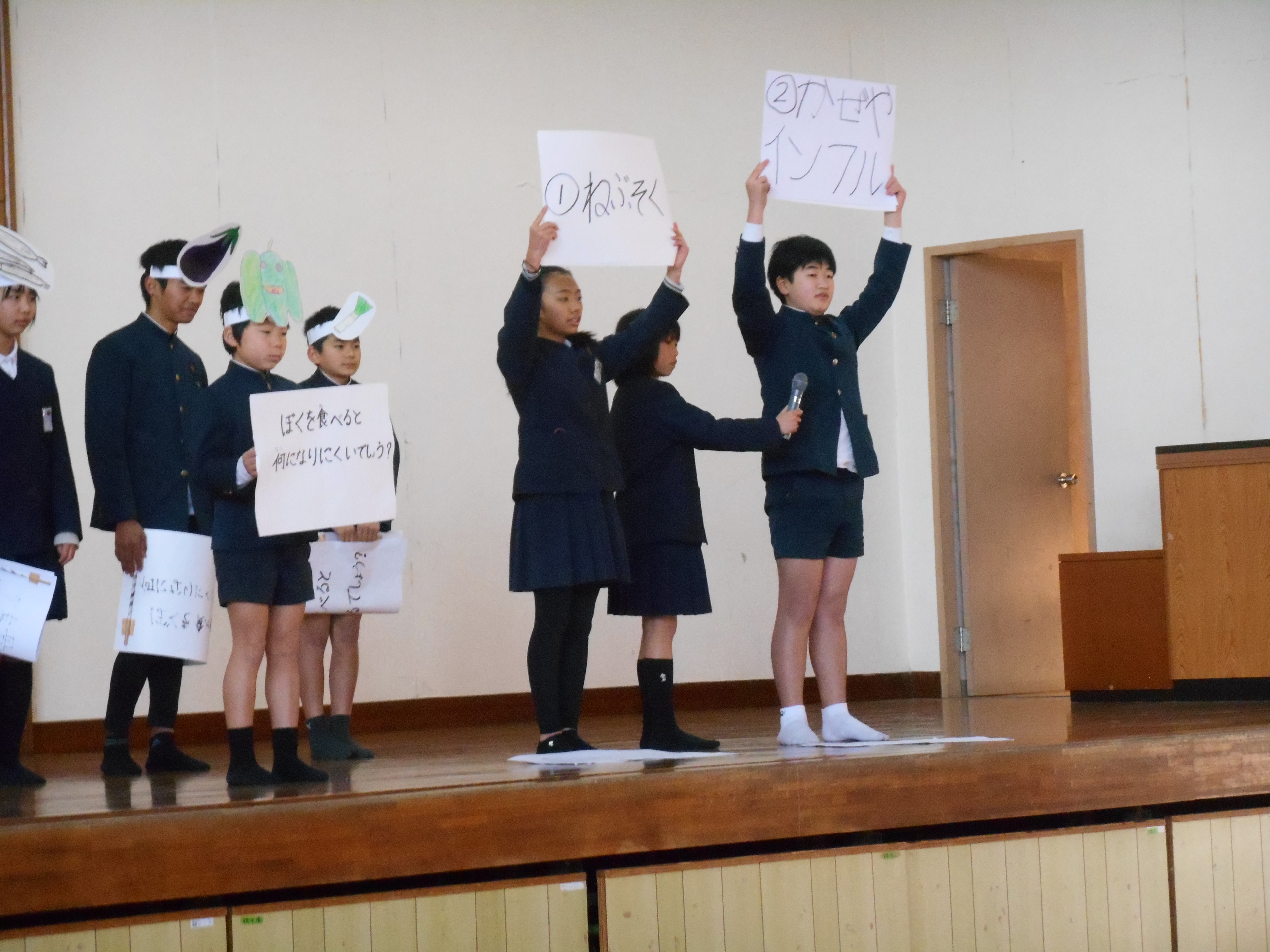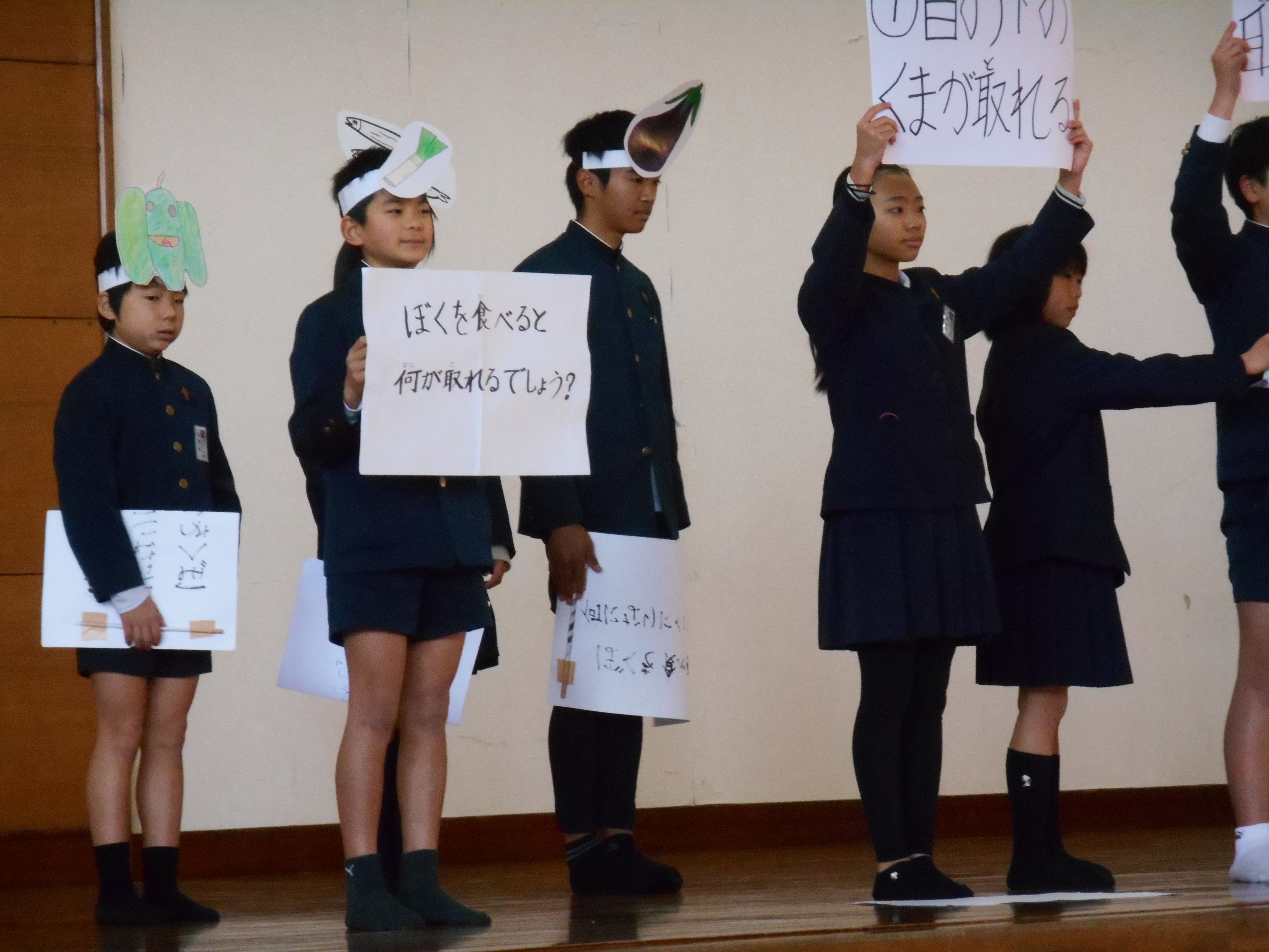 まず、給食委員会の子どもたちが考えた、野菜や魚を食べようという劇を見ました。