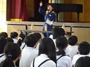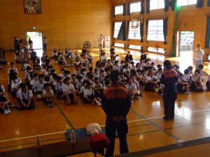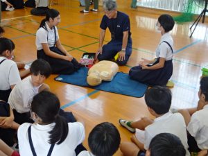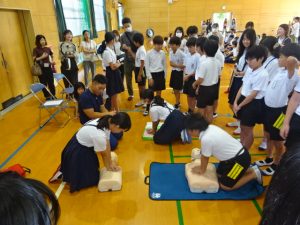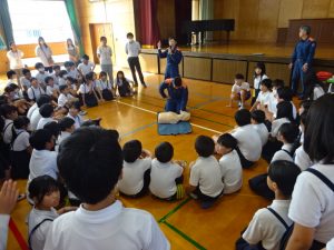 全会員の皆様と6年生の児童を対象に教育講演会を開催しました。今年度は救命講習をテーマに、鳥栖三養基消防本部からおいでいただき、心肺蘇生法とAEDの使い方にお話を聞きました。