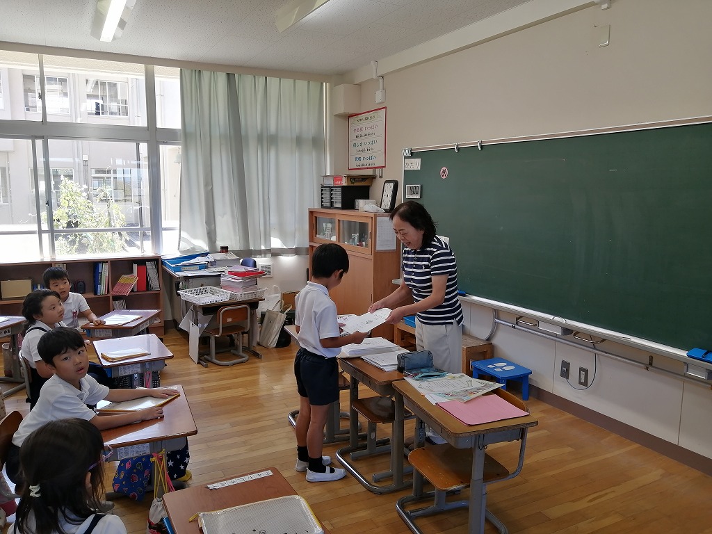 その後、各教室で前期の通知表が渡されました。1年生は初めての通知表で、担任から一言もらった後、嬉しそうに通知表を眺める姿がとても可愛らしかったです。